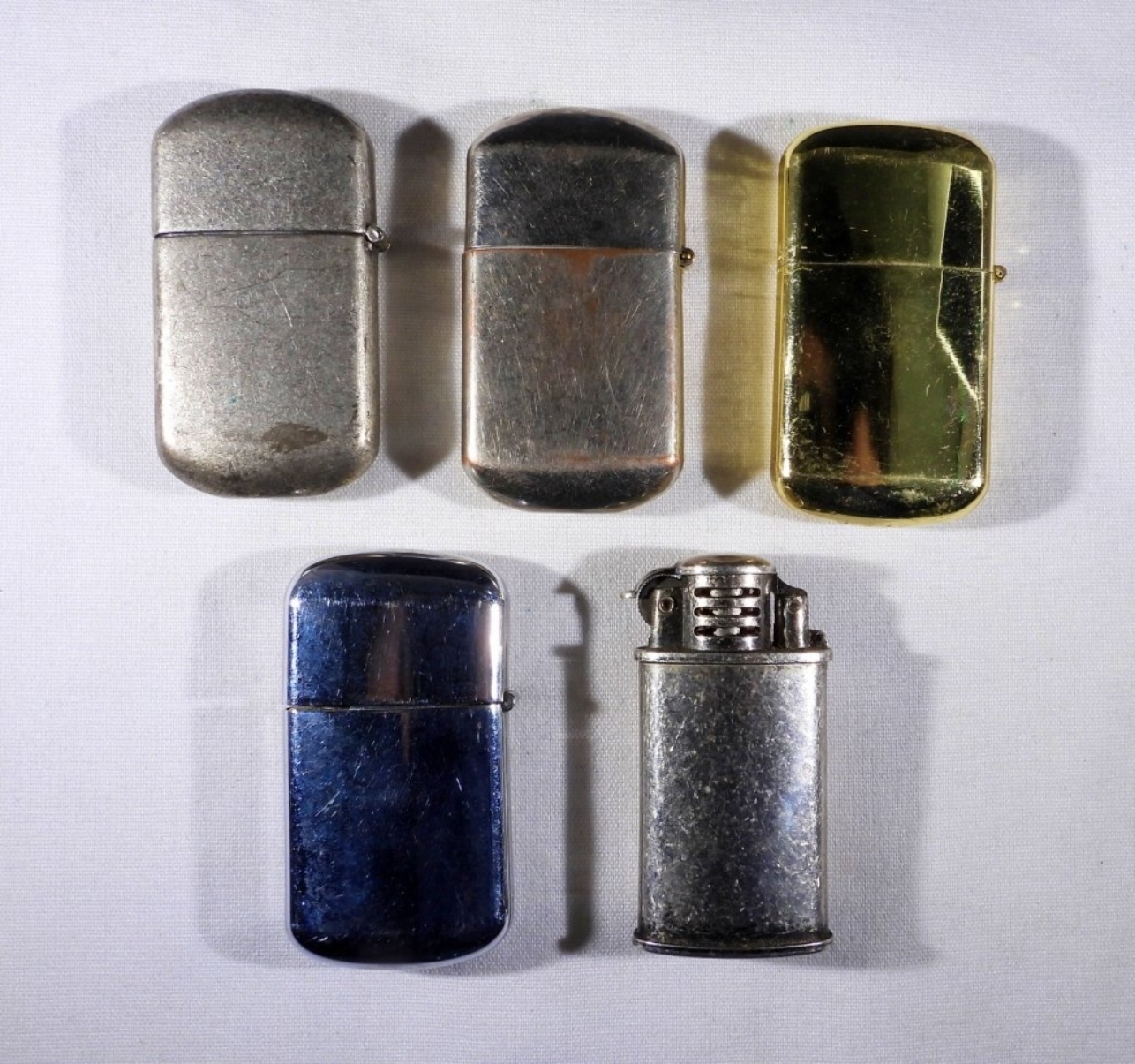 FIVE VINTAGE CAMEL BRAND LIGHTERS, ALL FIRED. 2.5″ TALL