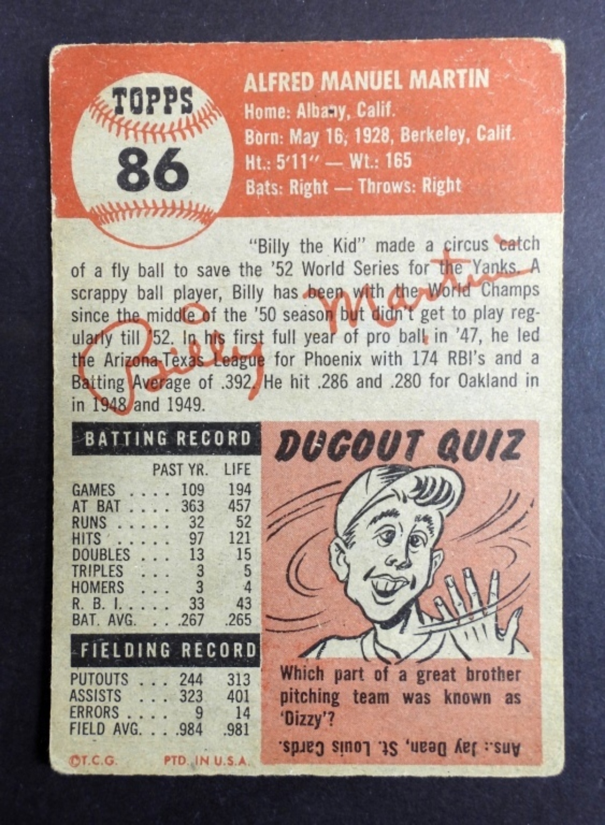 Good condition, 1953 TOPPS #86 Billy Martin
