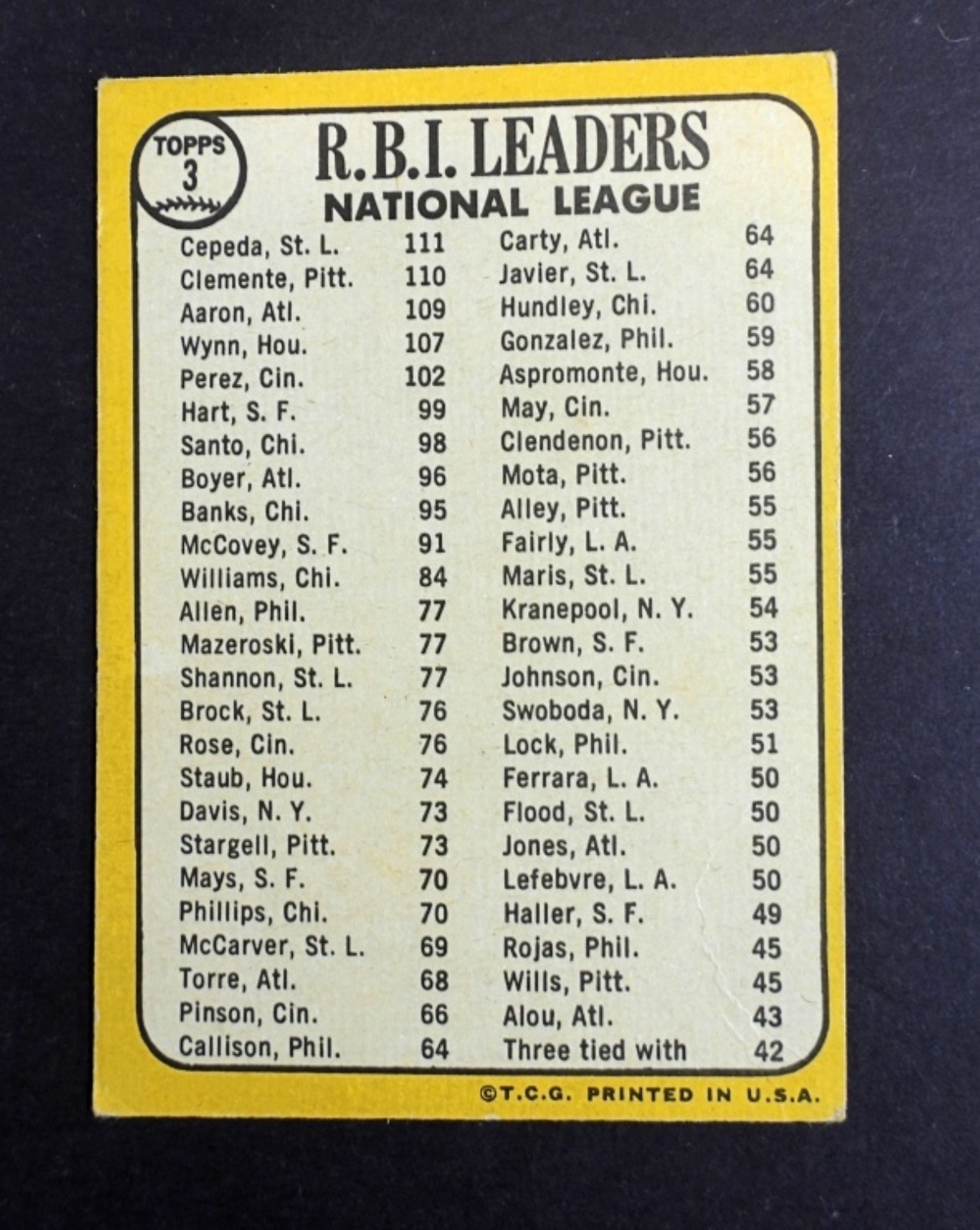 1967 RBI Leaders Orlando Cepeda, Bob Clemente, Hank Aaron, VG/EX