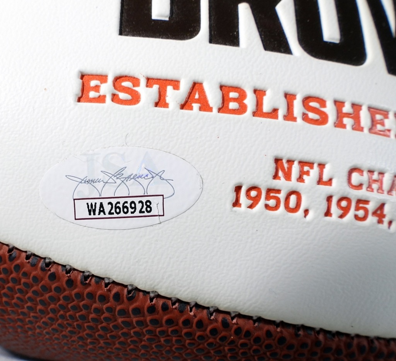 Jerome Ford #34 Cleveland Browns EST. 1946 football. Does have a JSA sticker but when typed into the database comes back as signed jersey instead.