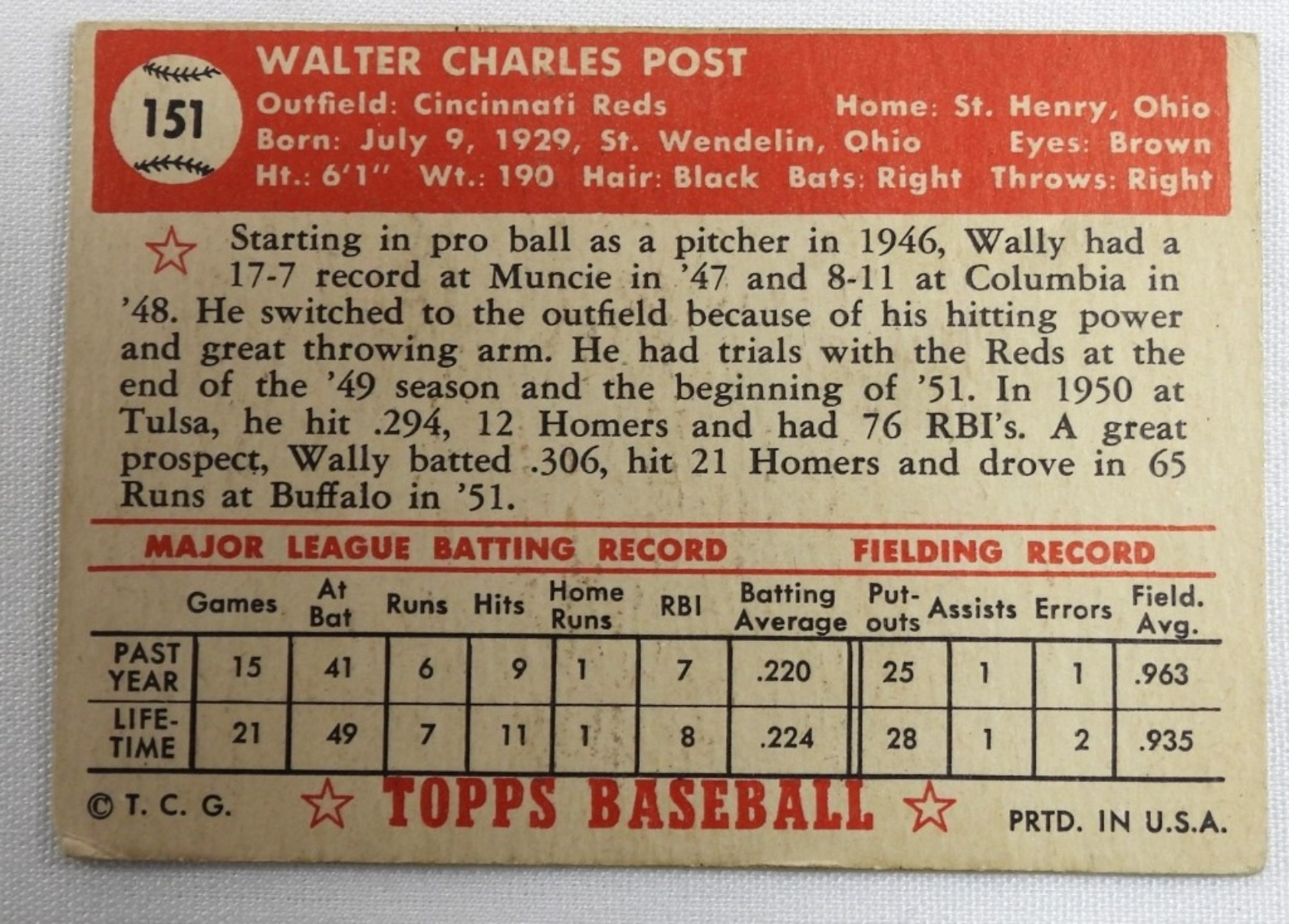 Wally Post #151, TOPPS, Good or better condition