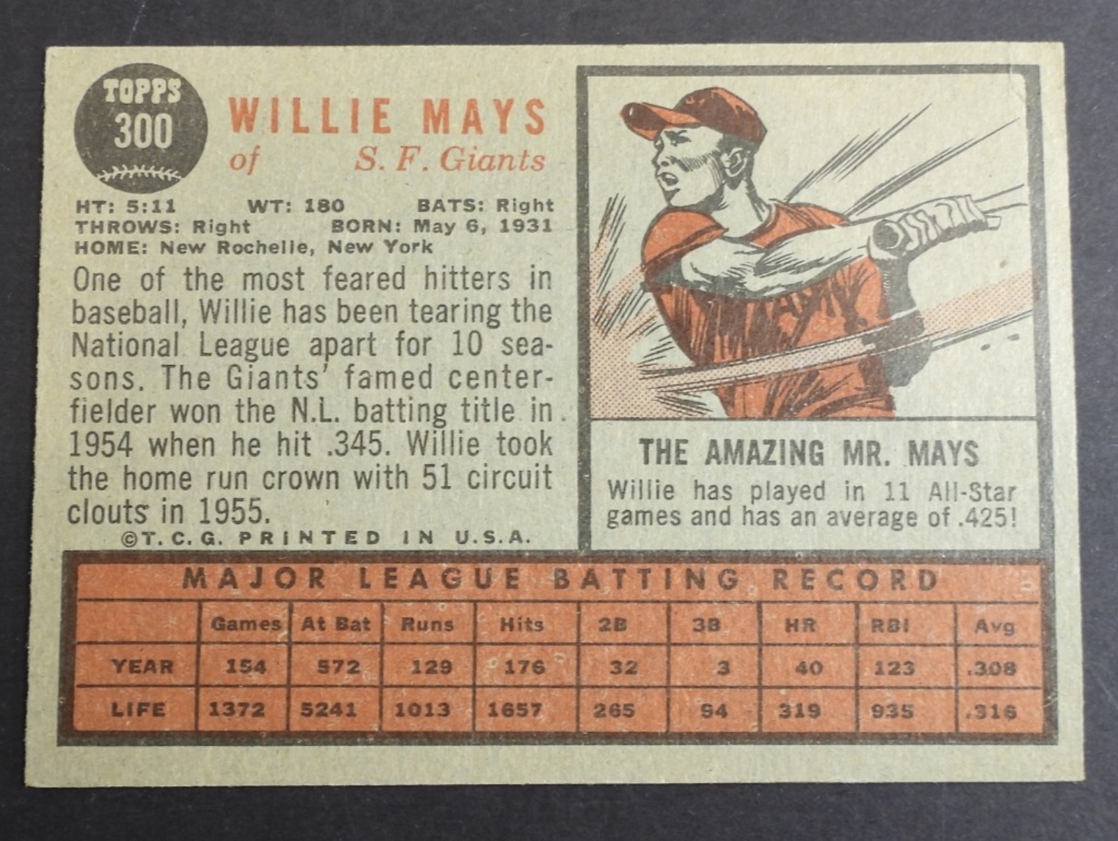 1962 TOPPS #300 Willie Mays New York Giants, Fair condition