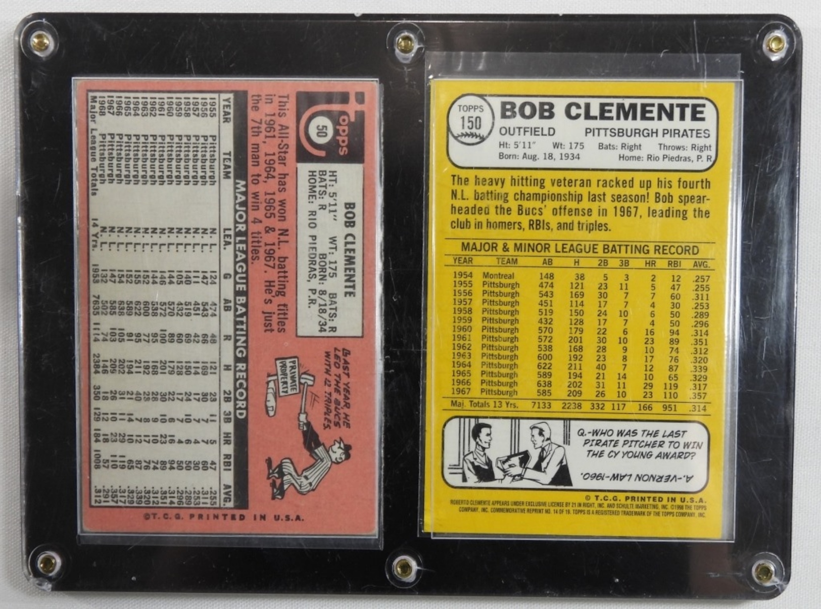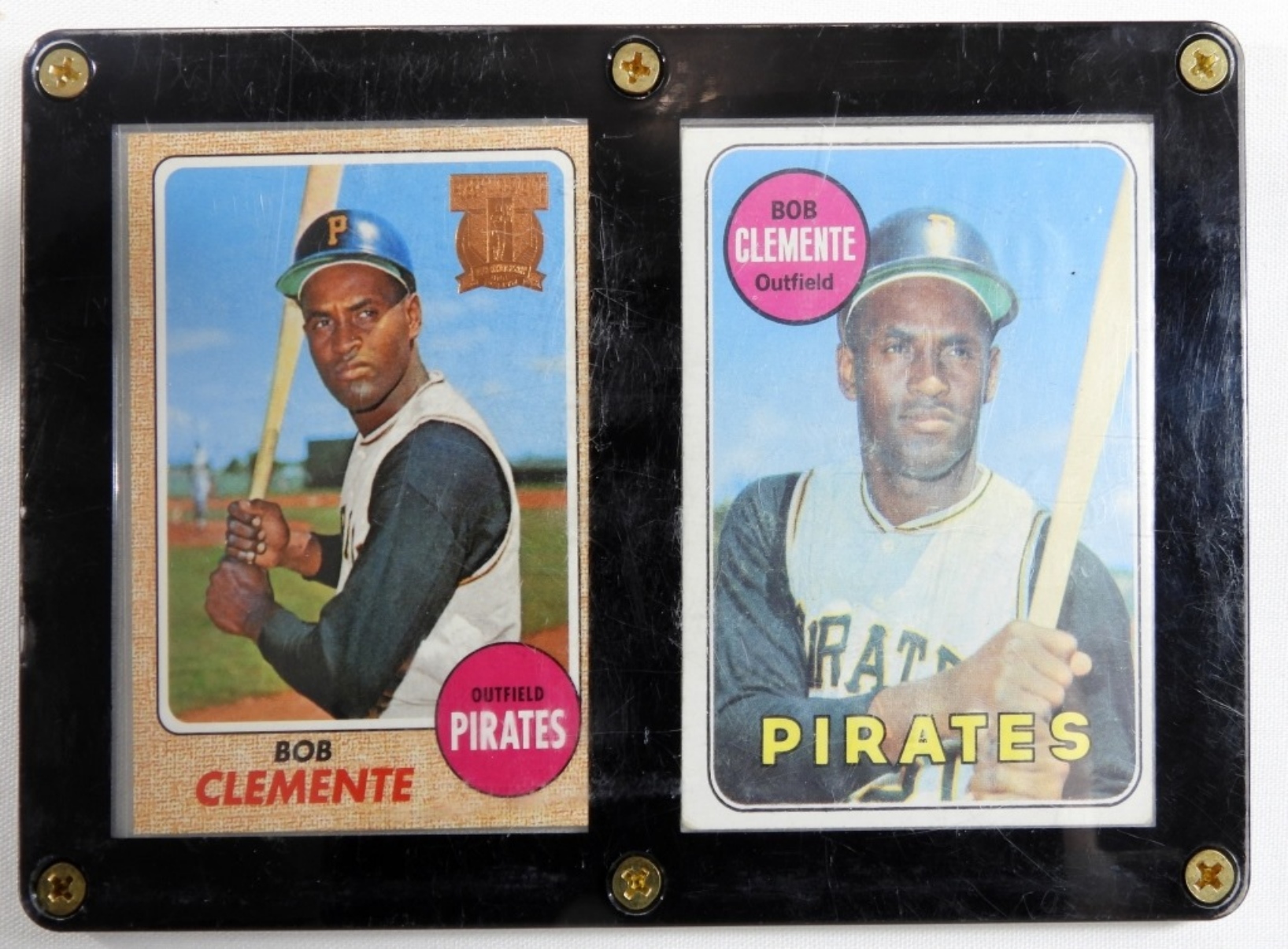 Both in a plaque, 1- 1998 Reprint of 1968 for 25th Anniversary, #150 Robert Clemente, 1- 1969 #50, Both cards good or better condition