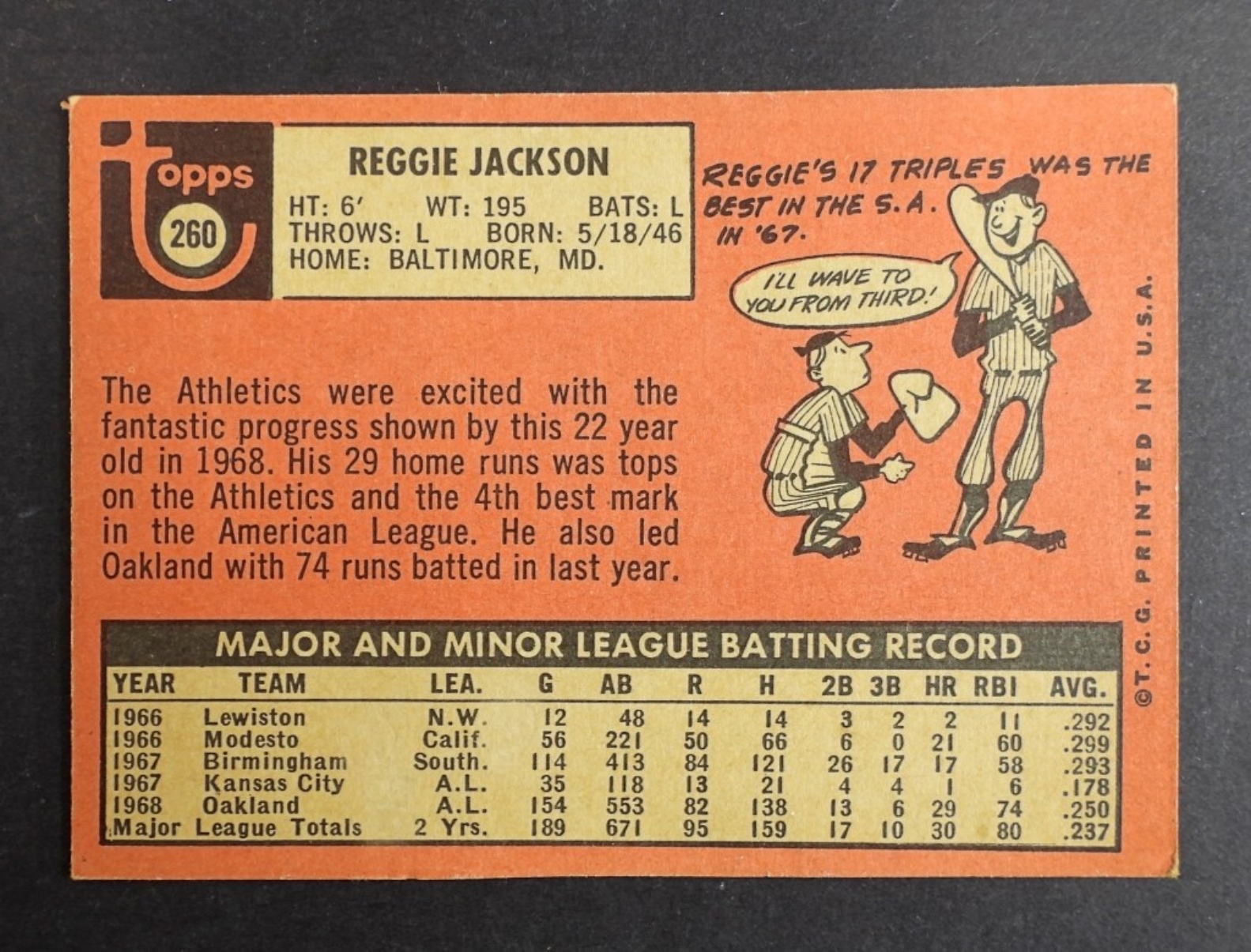 VG or better, TOPPS 1969 #260 Reggie Jackson, Oakland A’s