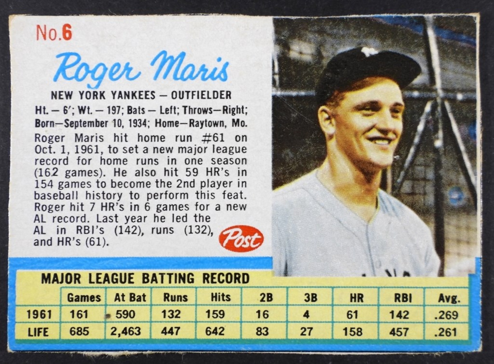 VG Hand cut in hard plastic sleeve Roger Maris, Outfielder