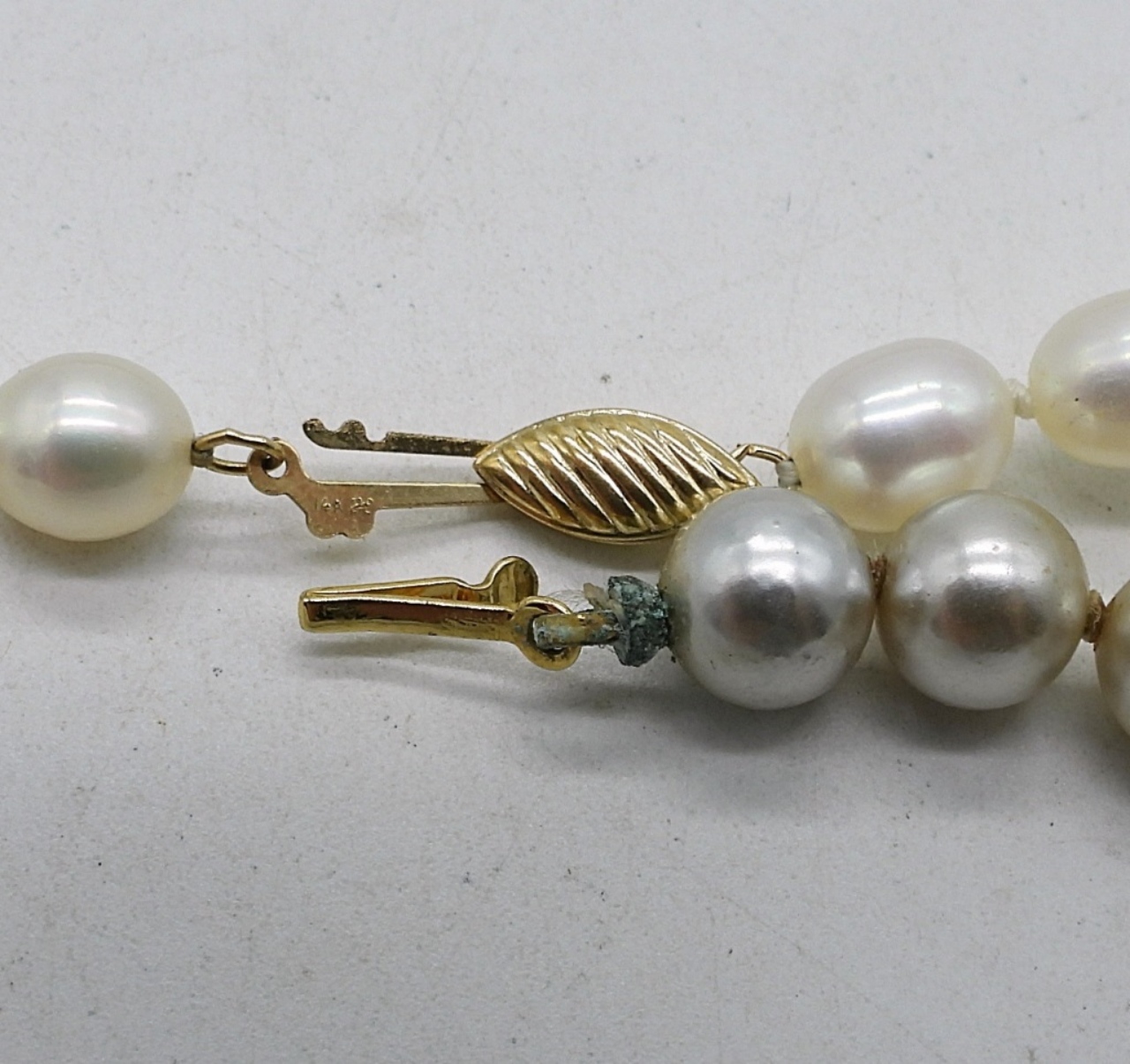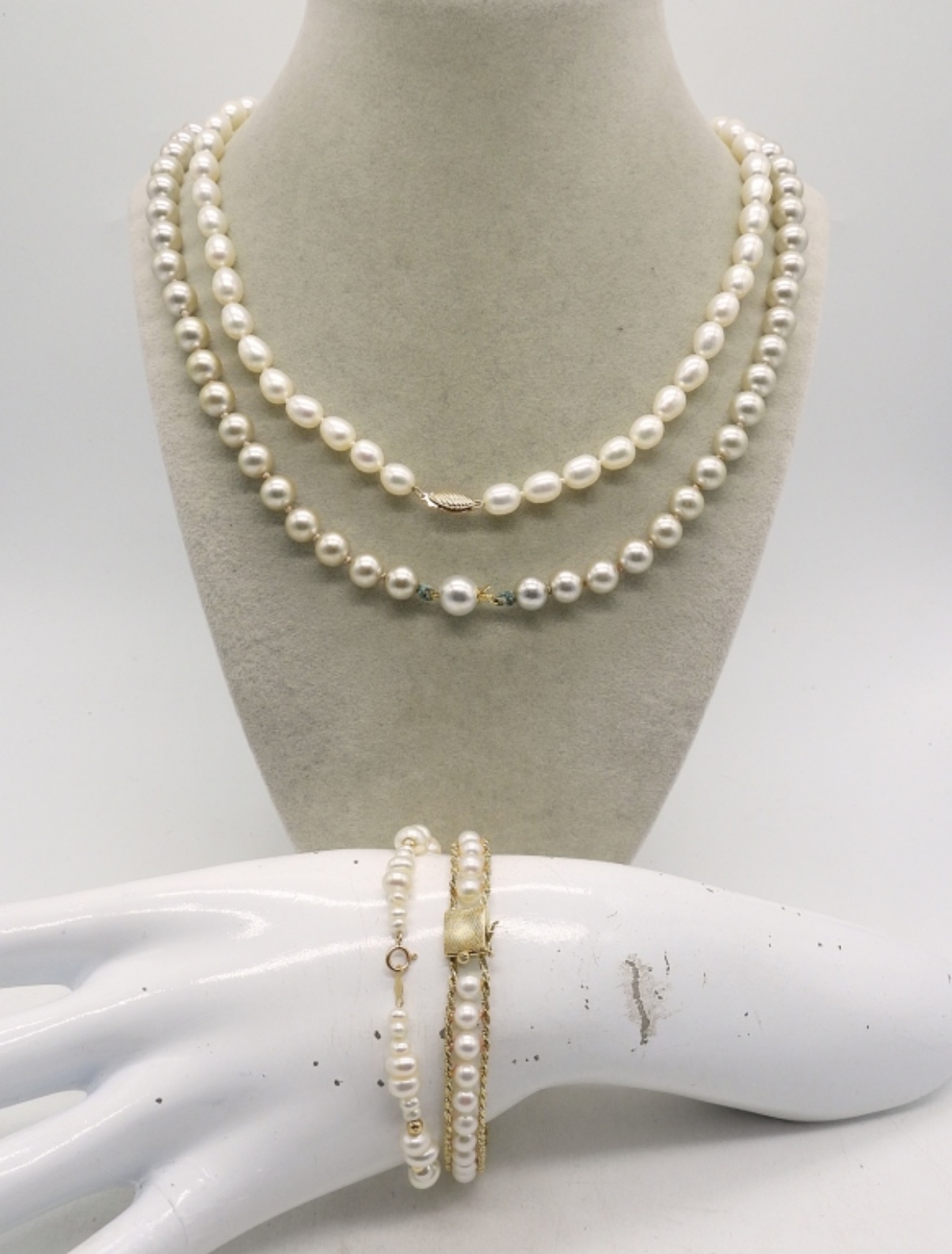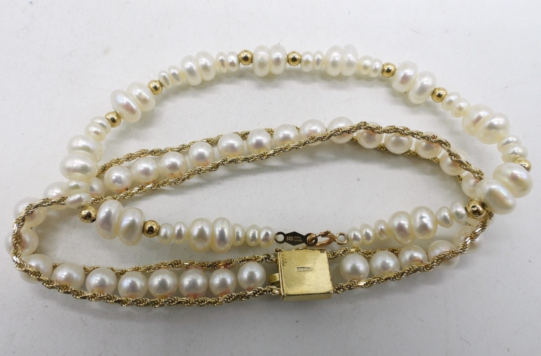 14K YELLOW GOLD CLASPS, PEARL NECKLACES AND BRACELETS. NECKLACES ARE 18″ & 23″. BRACELETS ARE 6-7″. (1.2 DWT / 14K)