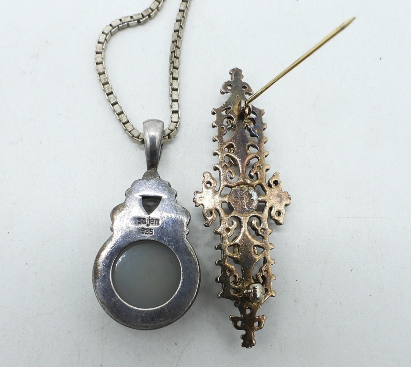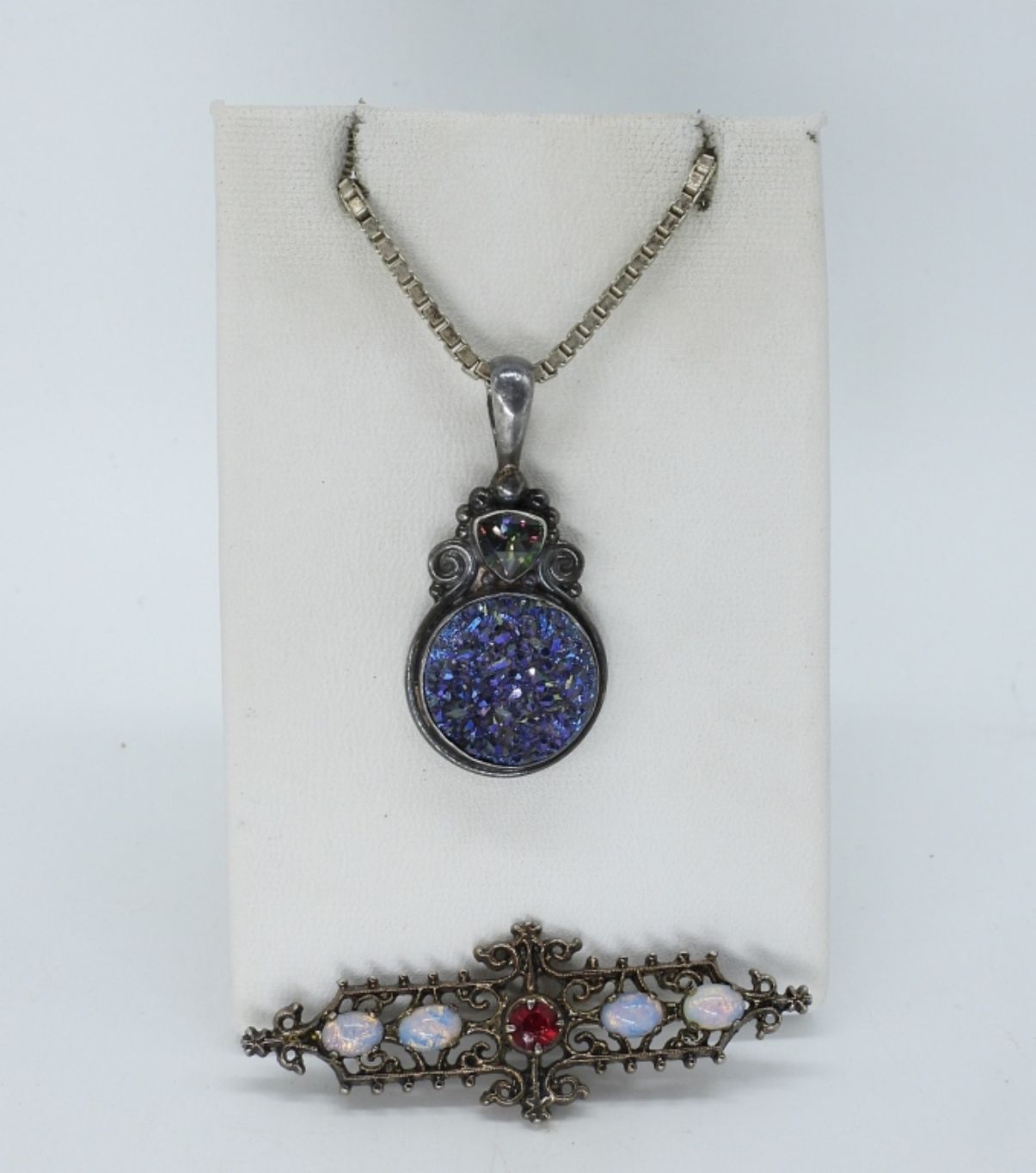 SAJEN PURPLE DRUZY & MYSTIC TOPAZ NECKLACE, 19″. SARAH COVENTRY STERLING BROOCH, 2″ WIDE. (15 DWT)