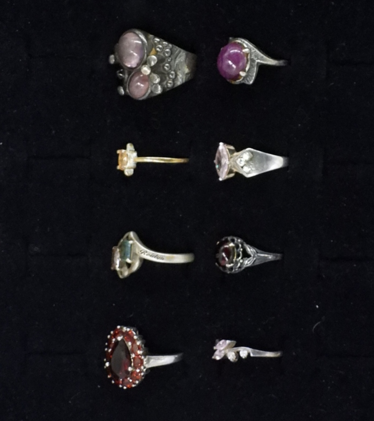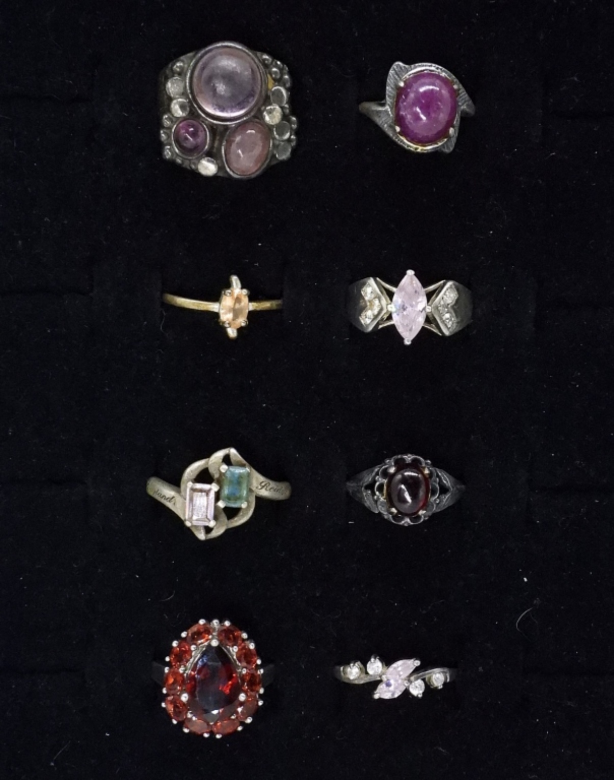 EIGHT STERLING GEMSTONE RINGS. AMETHYST, GARNET, PINK CZ & MORE. SIZES 6-9 (23.3 DWT)