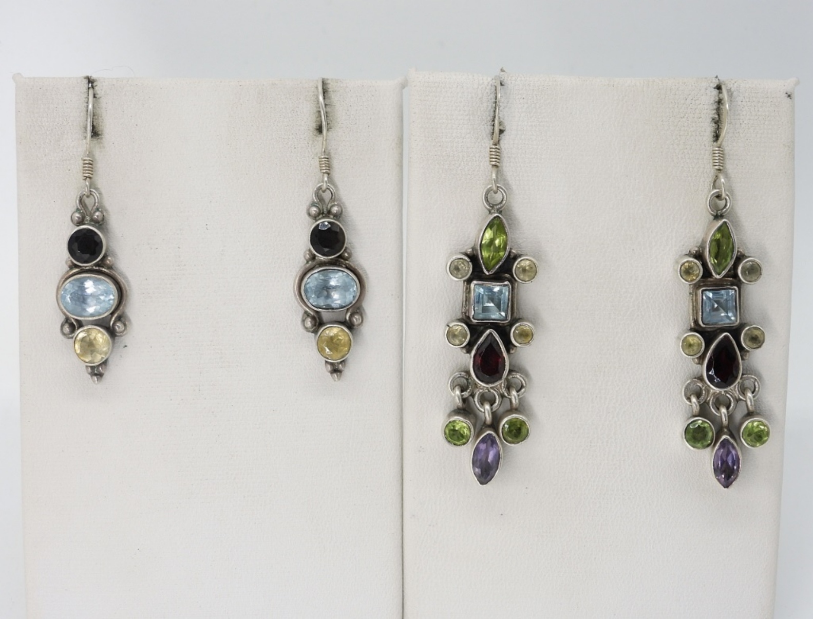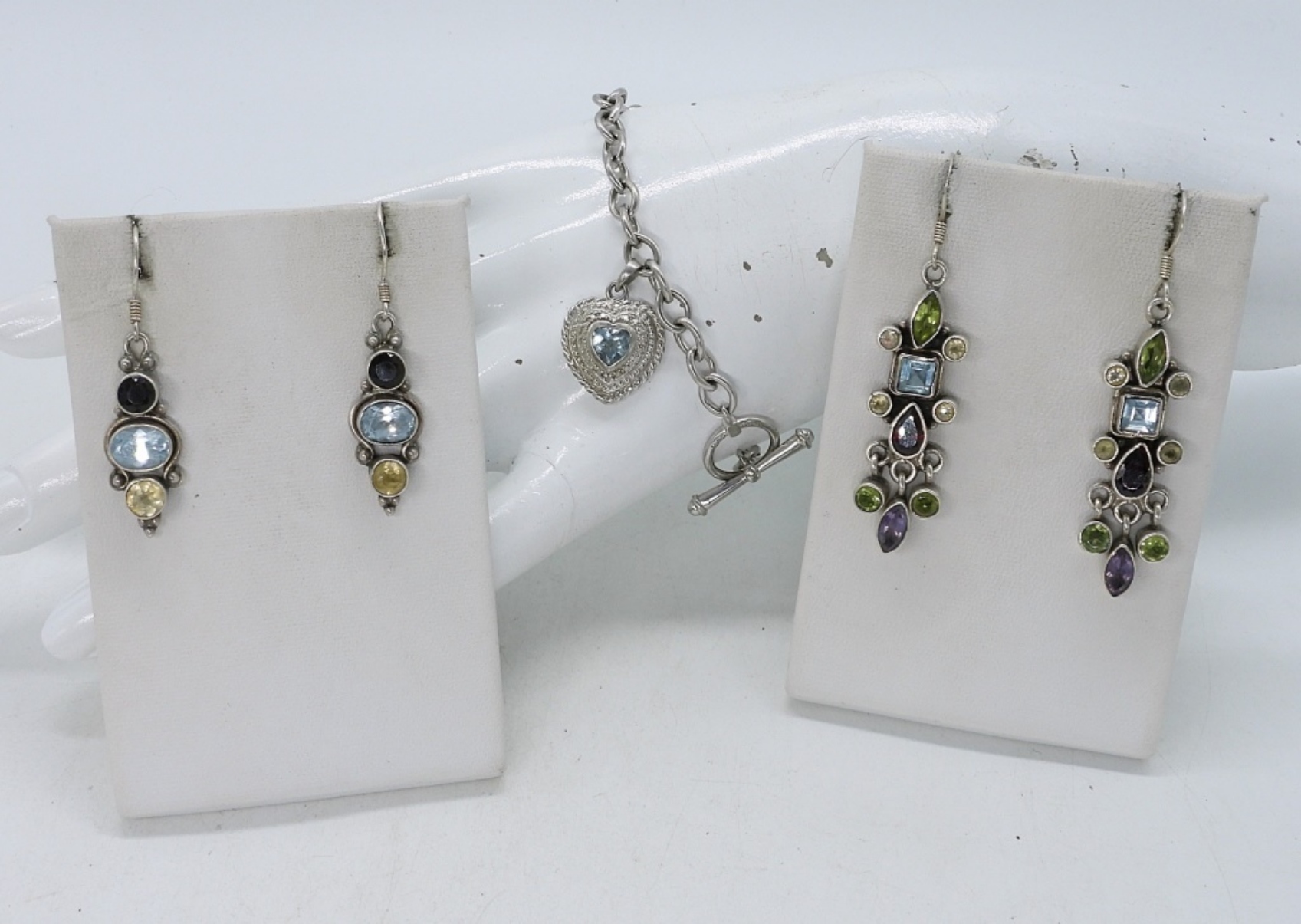 BLUE TOPAZ HEART BRACELET, STERLING, 7.5″. TWO PAIR OF PIERCED EARRINGS, BLUE TOPAZ, GARNET, CITRINE, AMETHYST. (22.4 DWT)