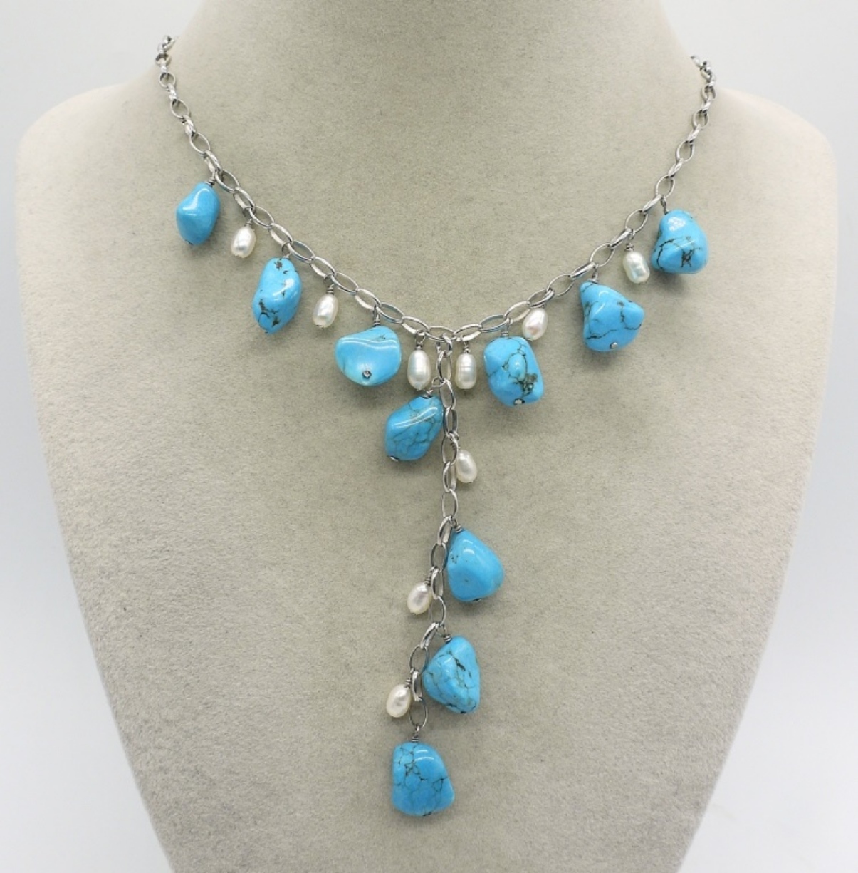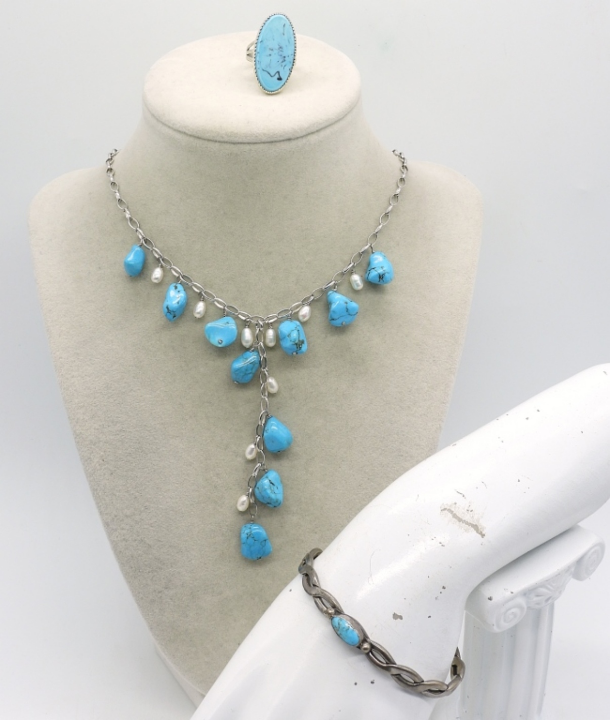 STERLING NECKLACE, RING AND BRACELET WITH TURQUOISE GEMSTONES. NECKLACE IS 18″. BRACELET IS A CUFF. RING SIZE 5 (28 DWT)