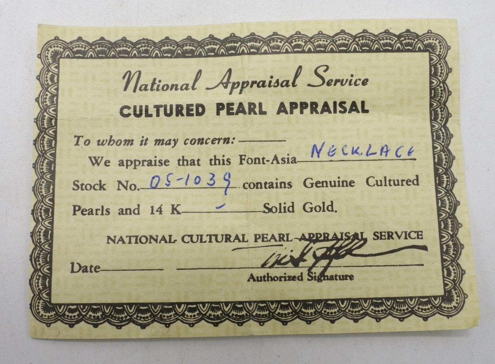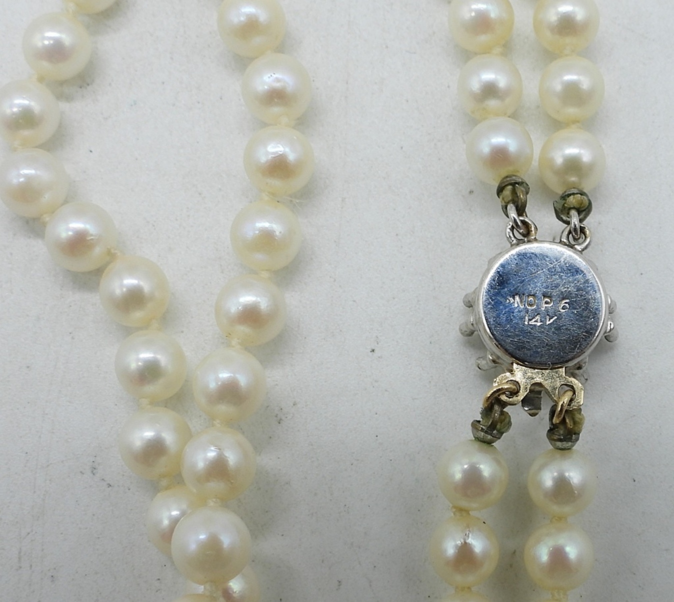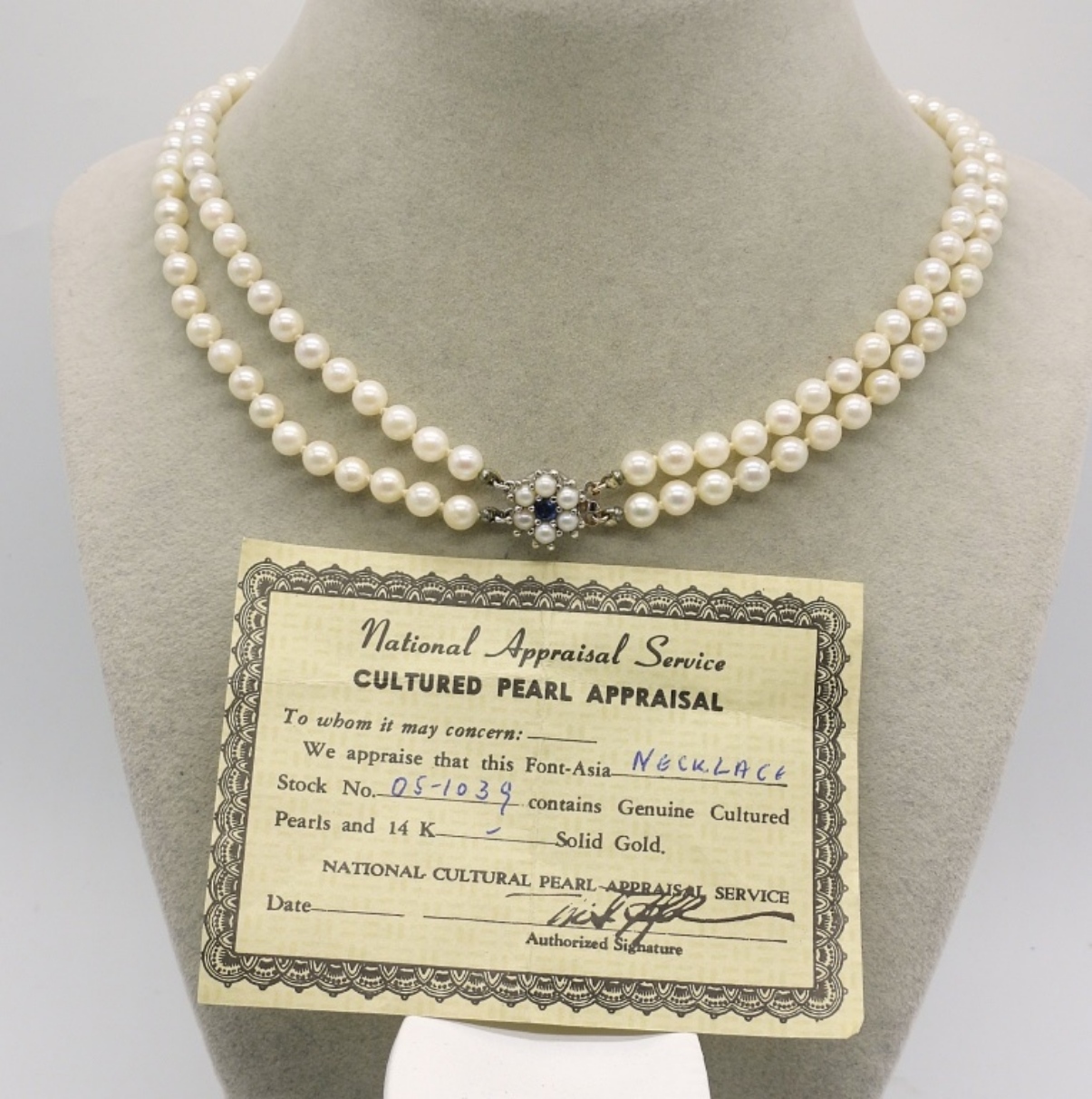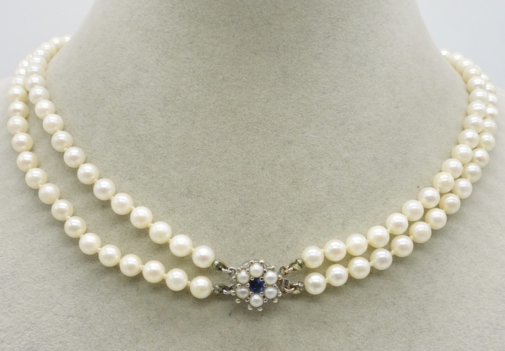 14K WHITE GOLD CLASP, DOUBLE STRAND OF PEARLS. SAPPHIRE CENTER STONE. 15″. COMES WITH AN APPRAISAL PAPER. (1.5 DWT / 14KG)