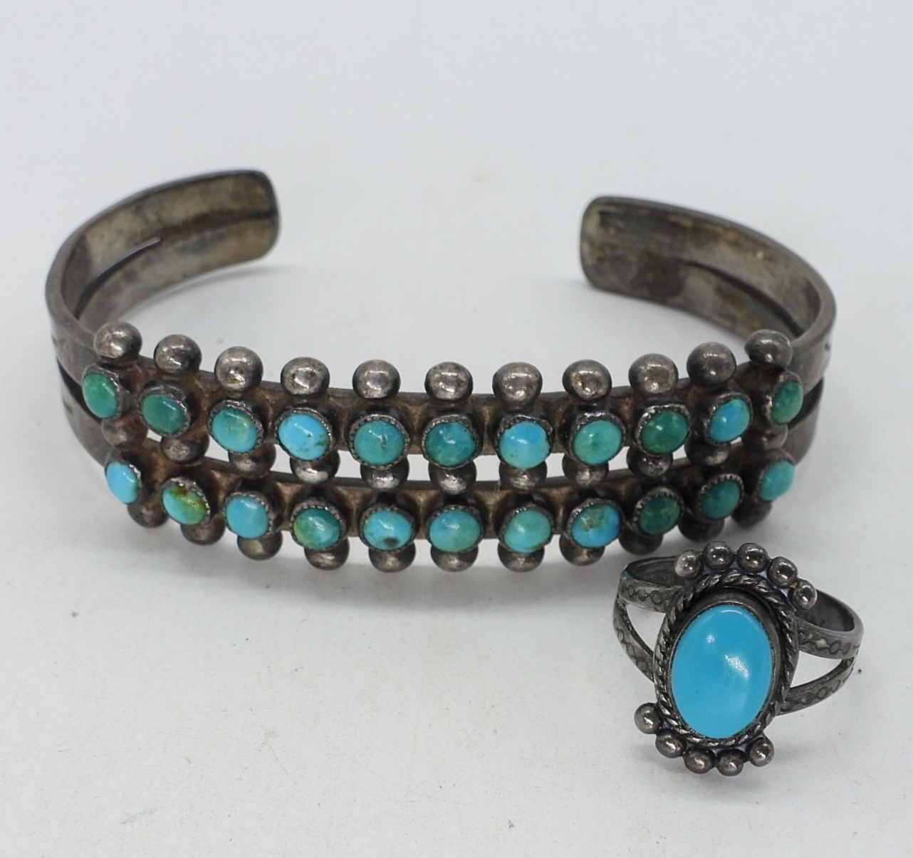 VINTAGE TURQUOISE STERLING CUFF BRACELET AND RING SIZE 5 (22 DWT)