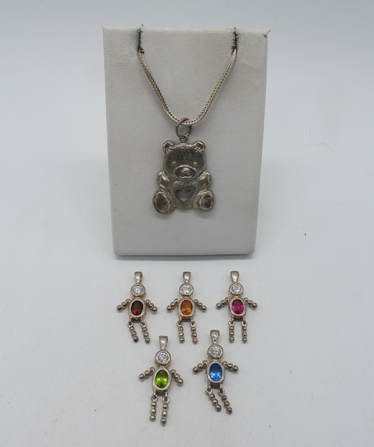 STERLING TEDDY BEAR PENDANT ON A 18″ CHAIN. FIVE BIRTHSTONE PENDANTS. (12.9 DWT)