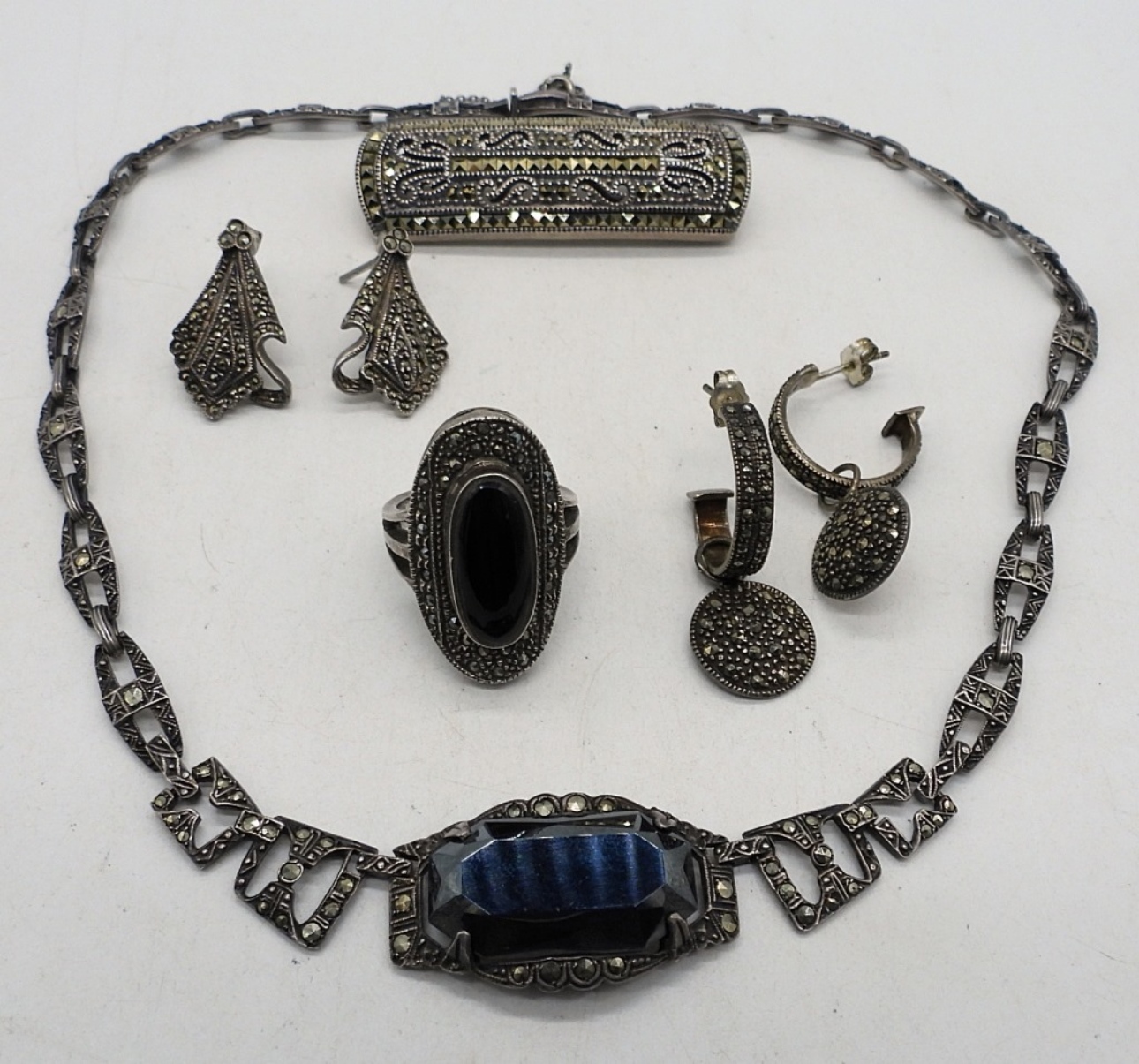 HEMATITE & MARCASITE STERLING NECKLACE WITH SAFETY CHAIN! 16″. TWO PAIR OF PIERCED MARCASITE EARRINGS. MARCASITE BROOCH, 2″. BLACK ONYX, MARCASITE SIZE 7 RING. (39.7 DWT)