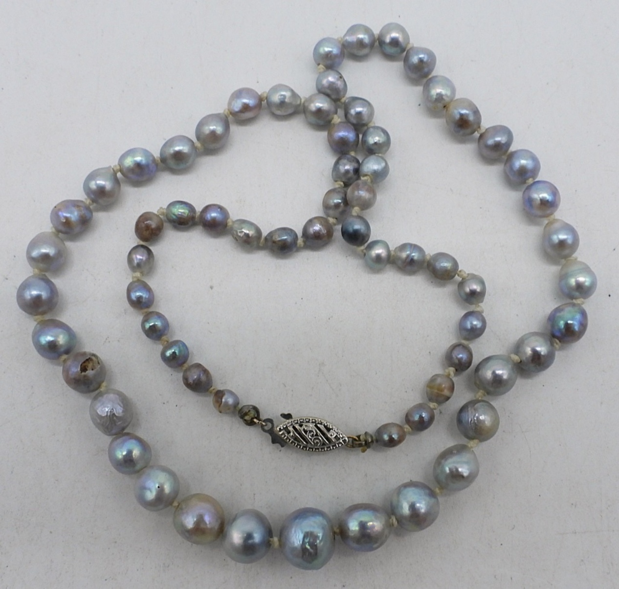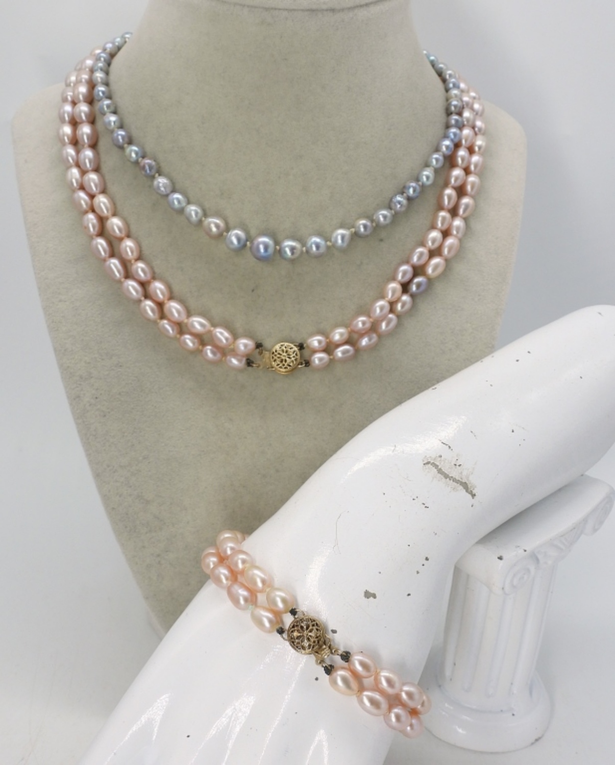 STERLING CLASPS, PINK PEARL NECKLACE & MATCHING BRACELET. 8″ & 16″. GRAY PEARL NECKLACE, 16″ WITH 925 CLASP. (2 DWT)