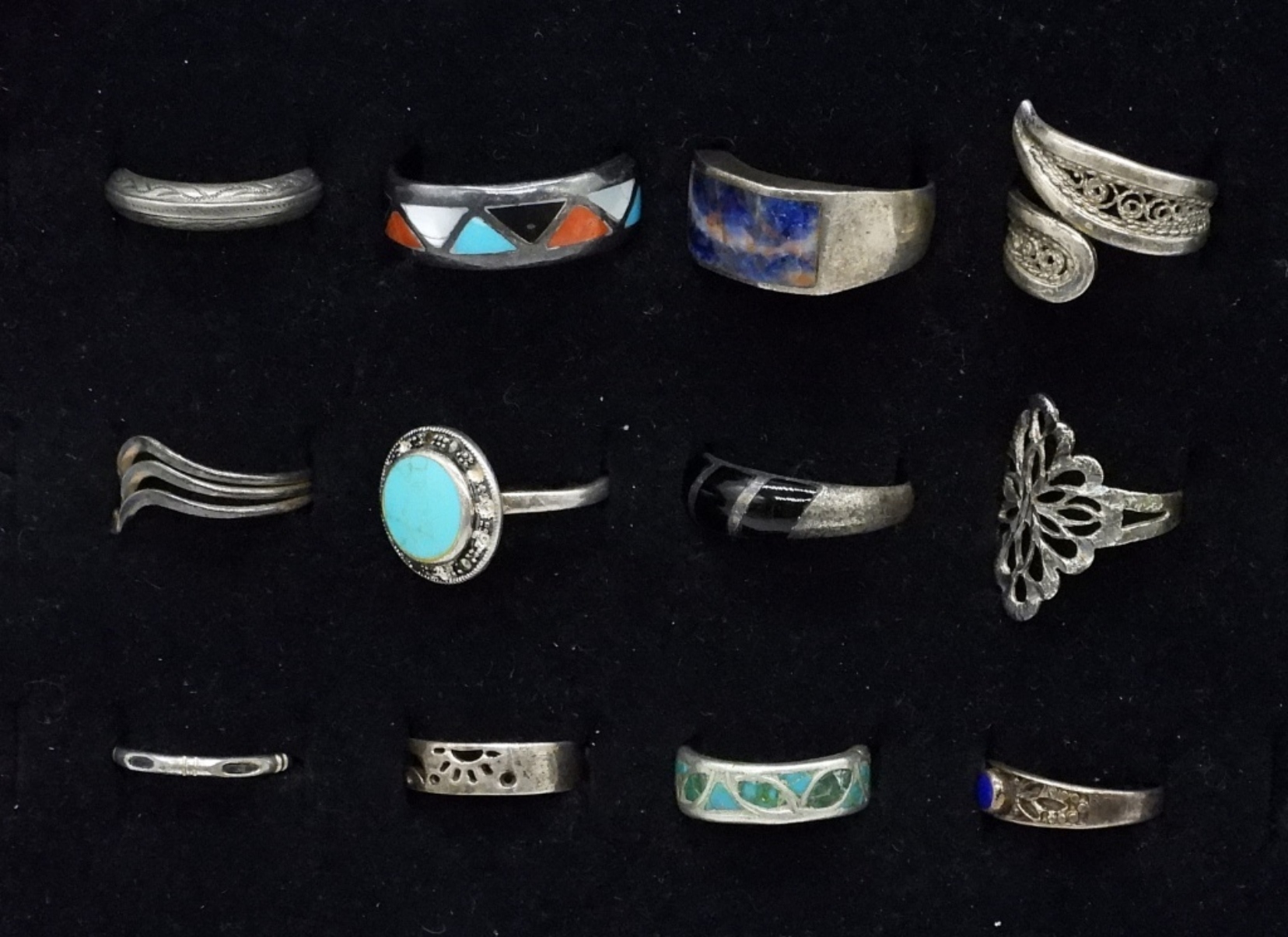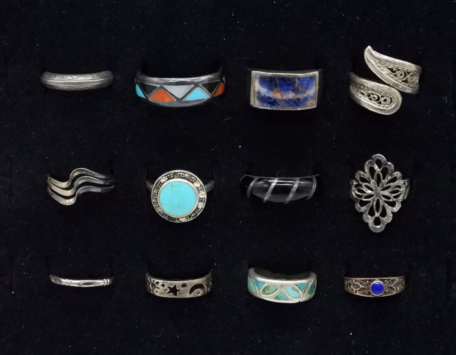 TWELVE STERLING RINGS. TURQUOISE INLAY, MOTHER OF PEARL, BLACK ONYX. SIZES 5-10 (27.8 DWT)