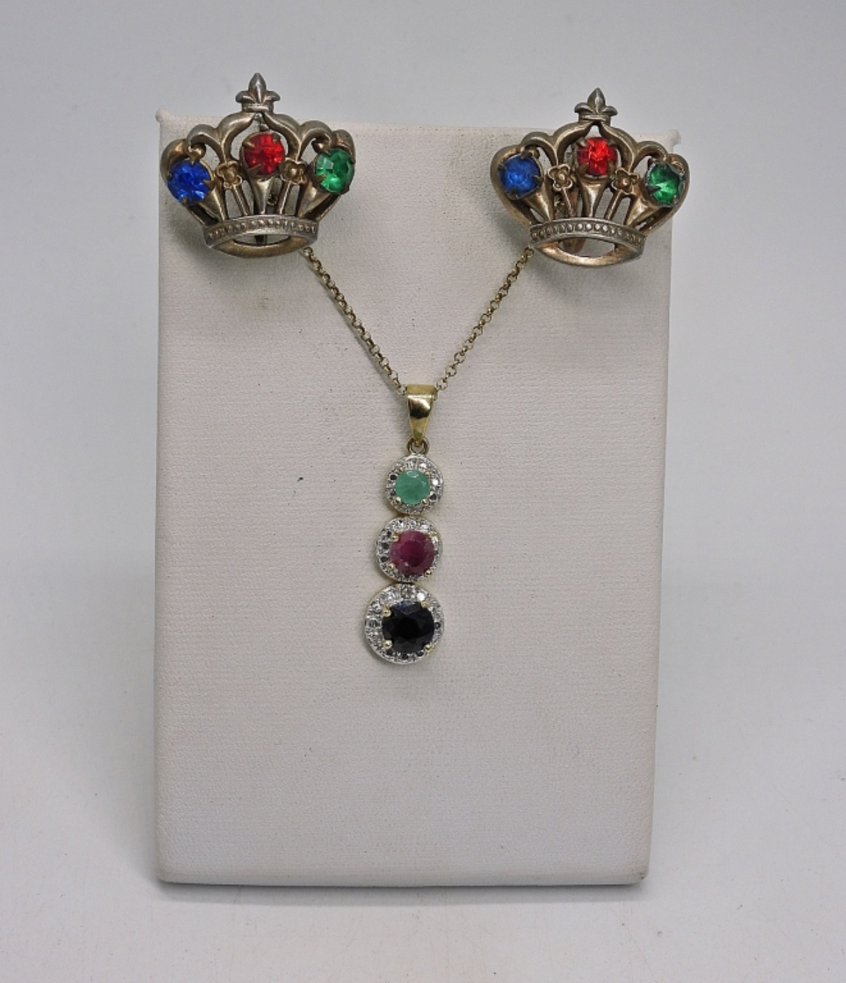 STERLING GOLD TONE NECKLACE WITH NATURAL EMERALD, RUBY & SAPPHIRE GEMSTONES, 18″. VINTAGE STERLING SCREW BACK EARRINGS. (SIMULATED GEMSTONES). 8.5 DWT
