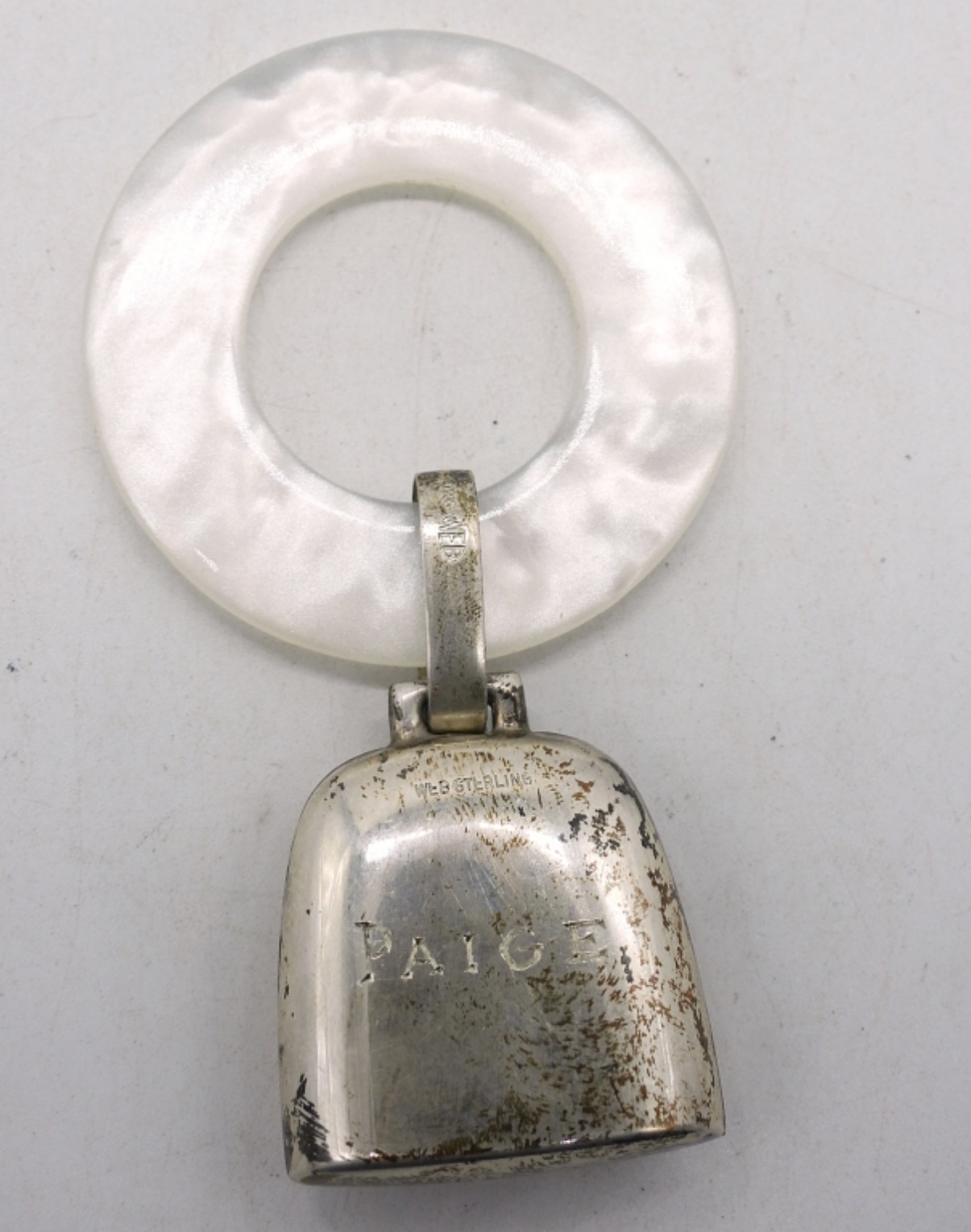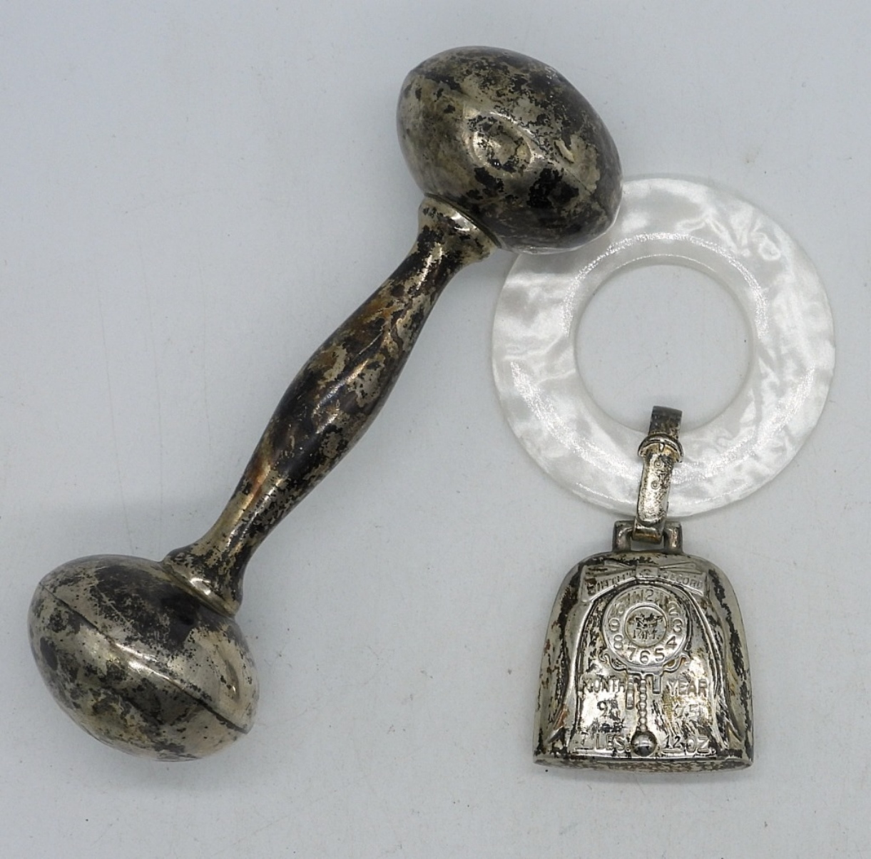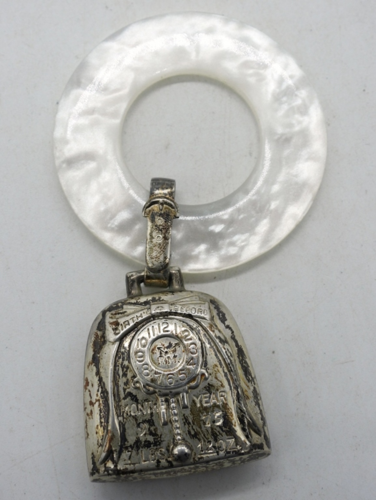 STERLING BABY RATTLE AND “BIRTH RECORD” PENDANT ON A WHITE PLASTIC RING (ENGRAVED WITH BIRTH DATE & WEIGHT). RATTLE IS 4″. (20.3 DWT)