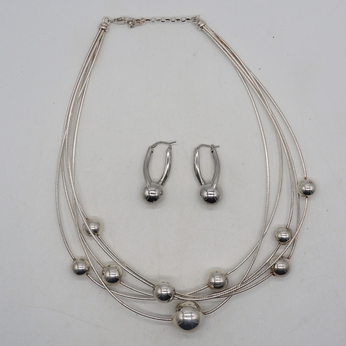 PAOLA VALENTINI STERLING ITALY MODERNIST NECKLACE, 20″. STERLING PIERCED EARRINGS, 1.5″. (46 DWT)