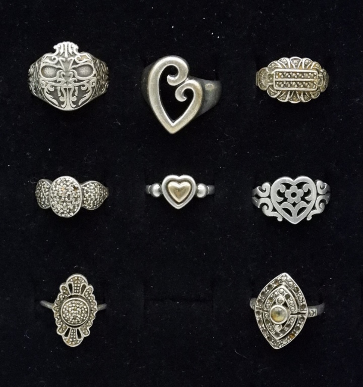 EIGHT STERLING MARCASITE & OTHER RINGS. SIZES 6-7.5 (26.8 DWT)