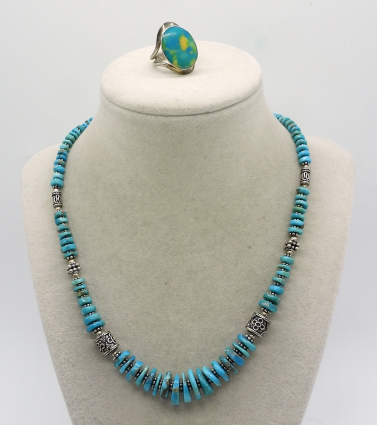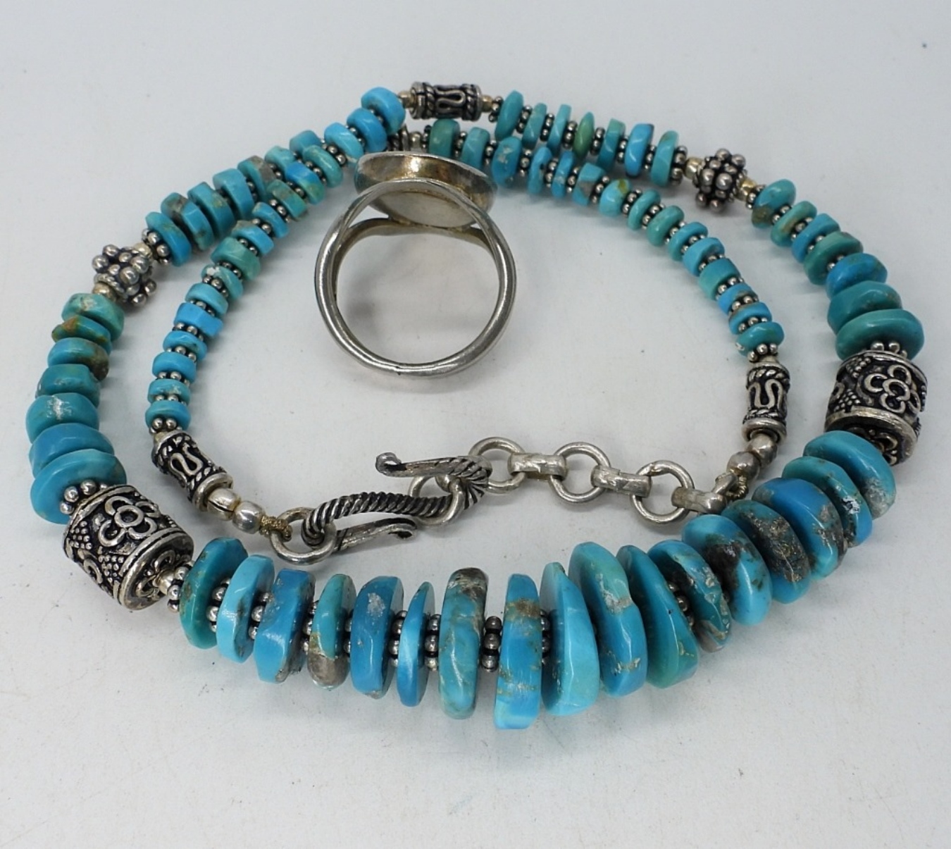 STERLING TURQUOISE BEADED NECKLACE, 17.5″. STERLING RING WITH BLUE & YELLOW GEMSTONE, SIZE 6.5 (24.4 DWT)