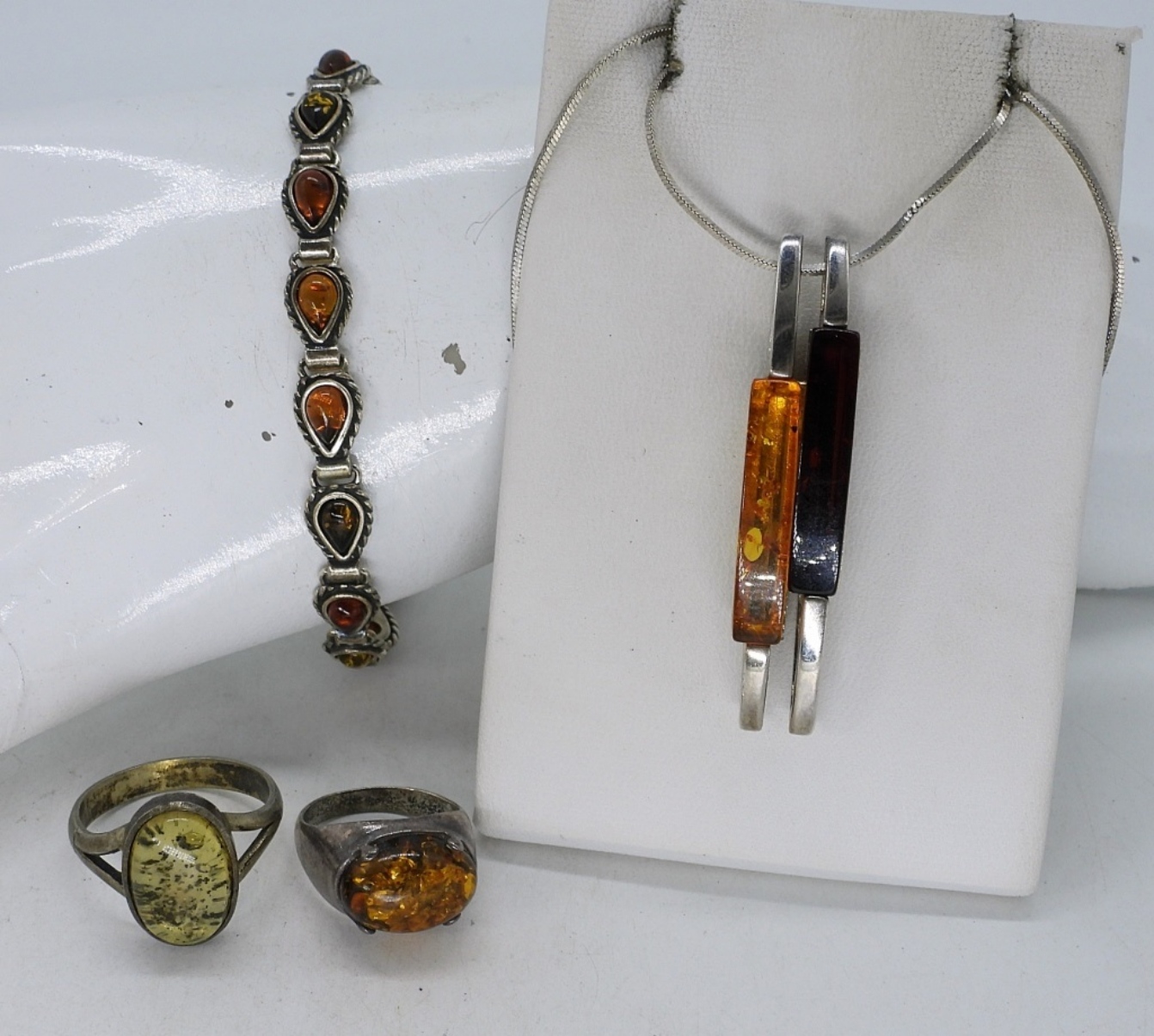 VINTAGE STERLING, AMBER NECKLACE 20″. BRACELET 7.5″. RINGS ARE 5 & 9.5 (20 DWT)
