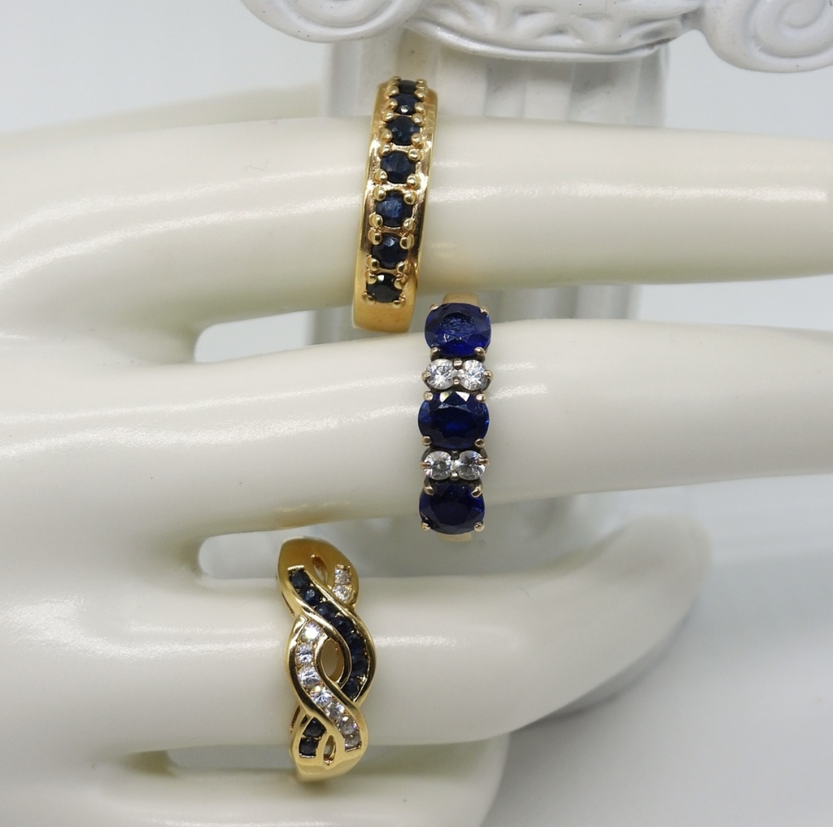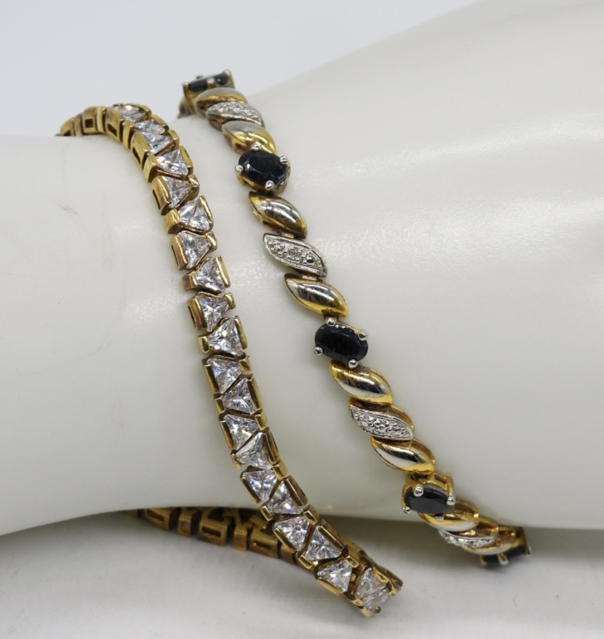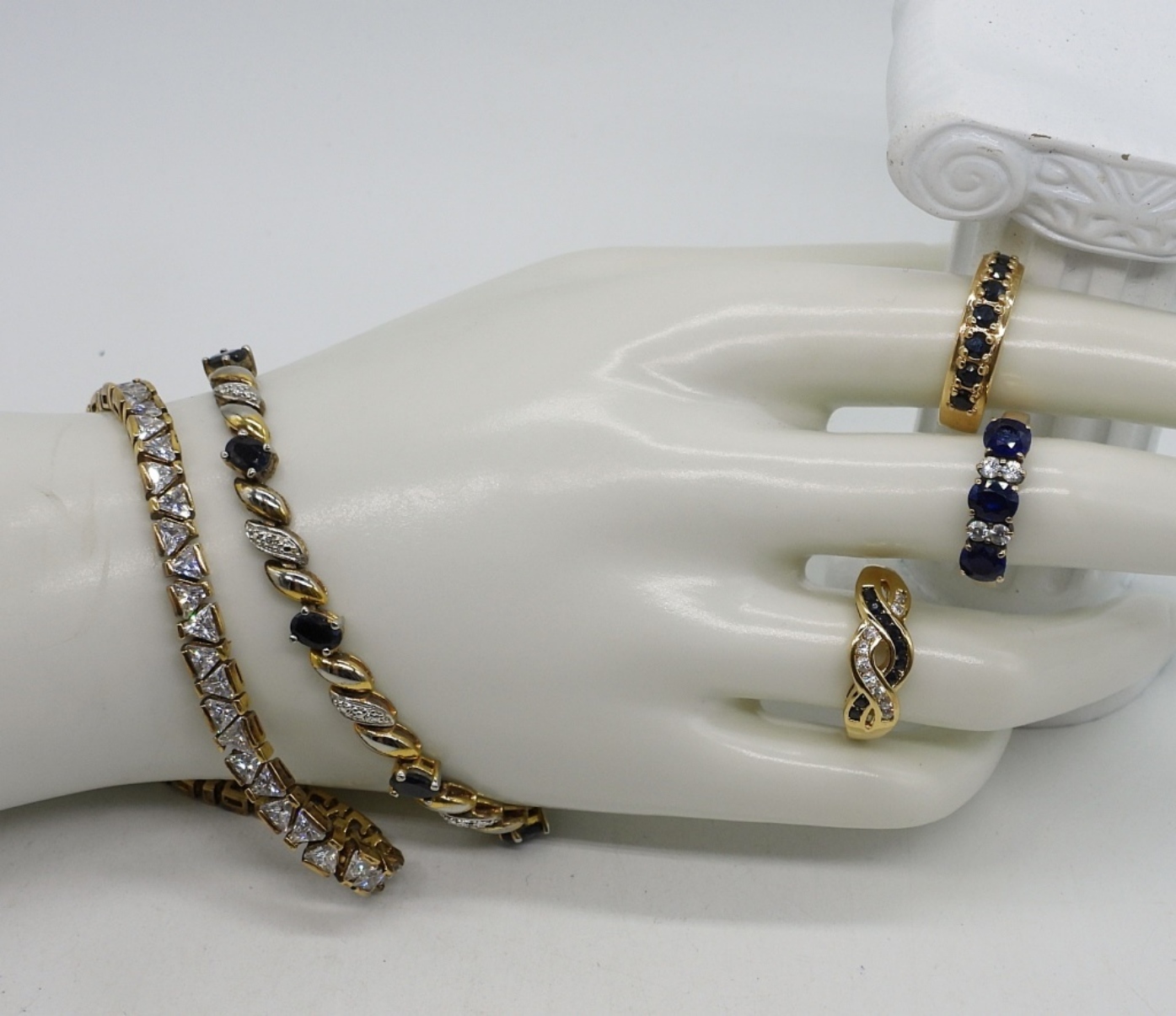 TWO GOLD TONE STERLING TENNIS BRACELETS. SIMULATED DIAMONDS & SAPPHIRES, 7.5″. THREE GOLD TONE STERLING RINGS WITH SIMULATED DIAMONDS AND SAPPHIRES. SIZES 6.5-7.5 (29.3 DWT)