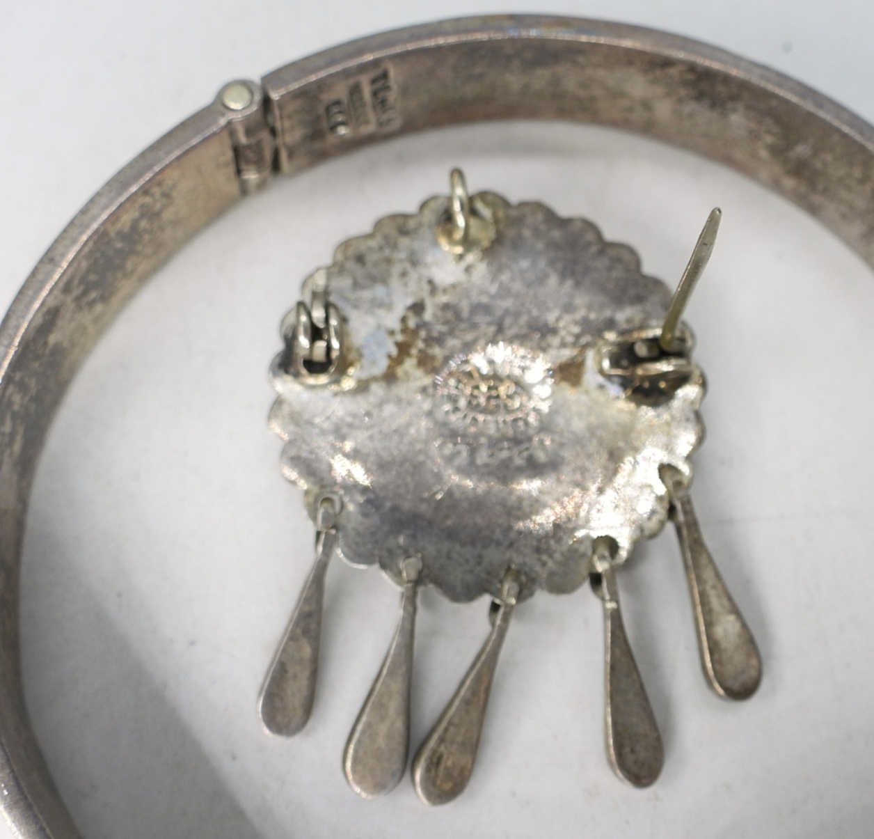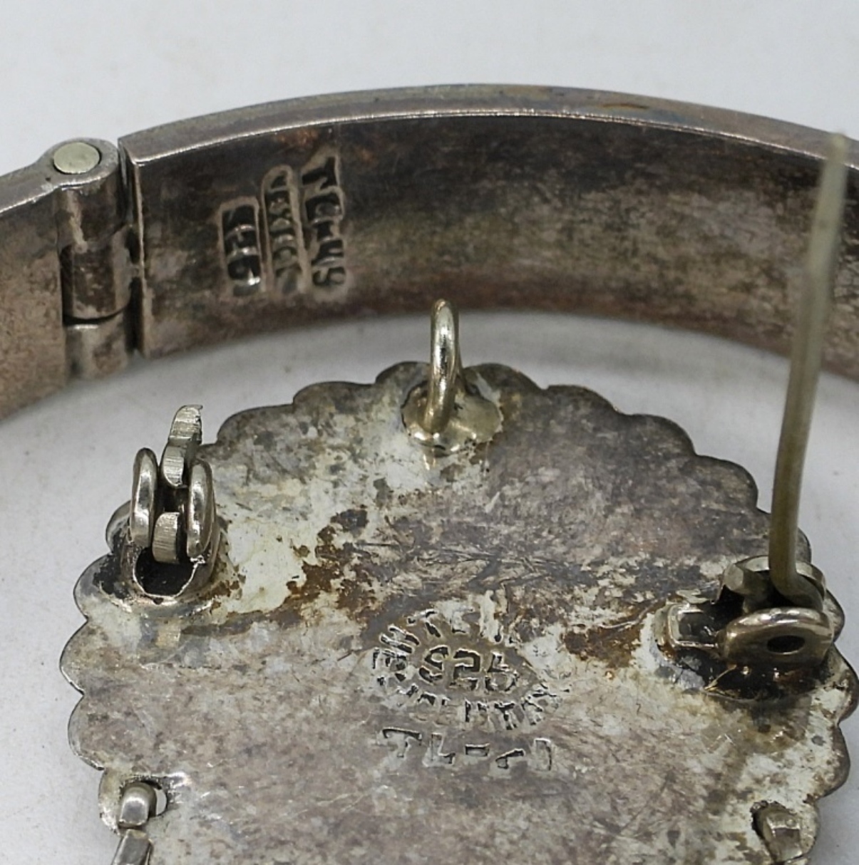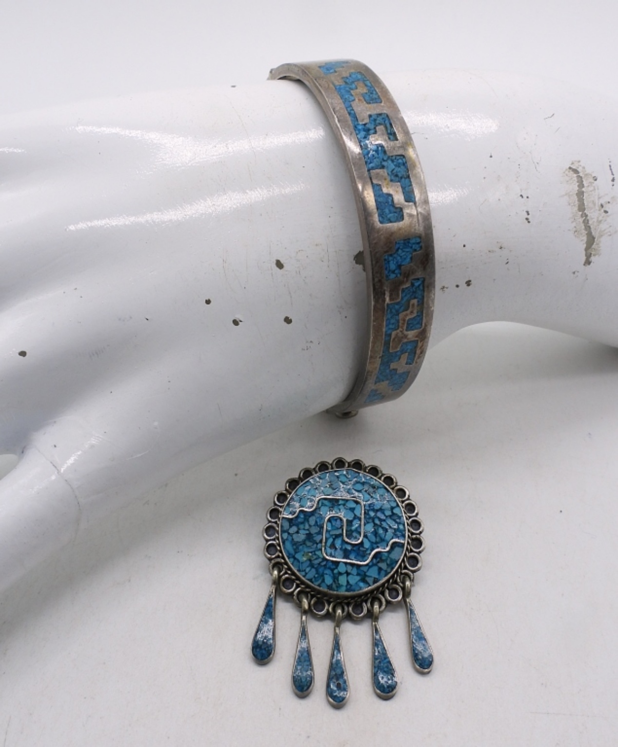 VINTAGE TAXCO STERLING TURQUOISE INLAY BRACELET “TC-49″ 8”. TAXCO STERLING TURQUOISE INLAY PIN “TL-?0”. (29 DWT)