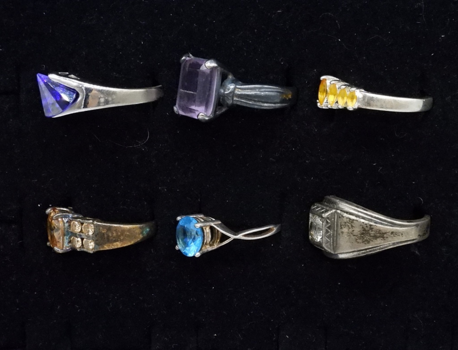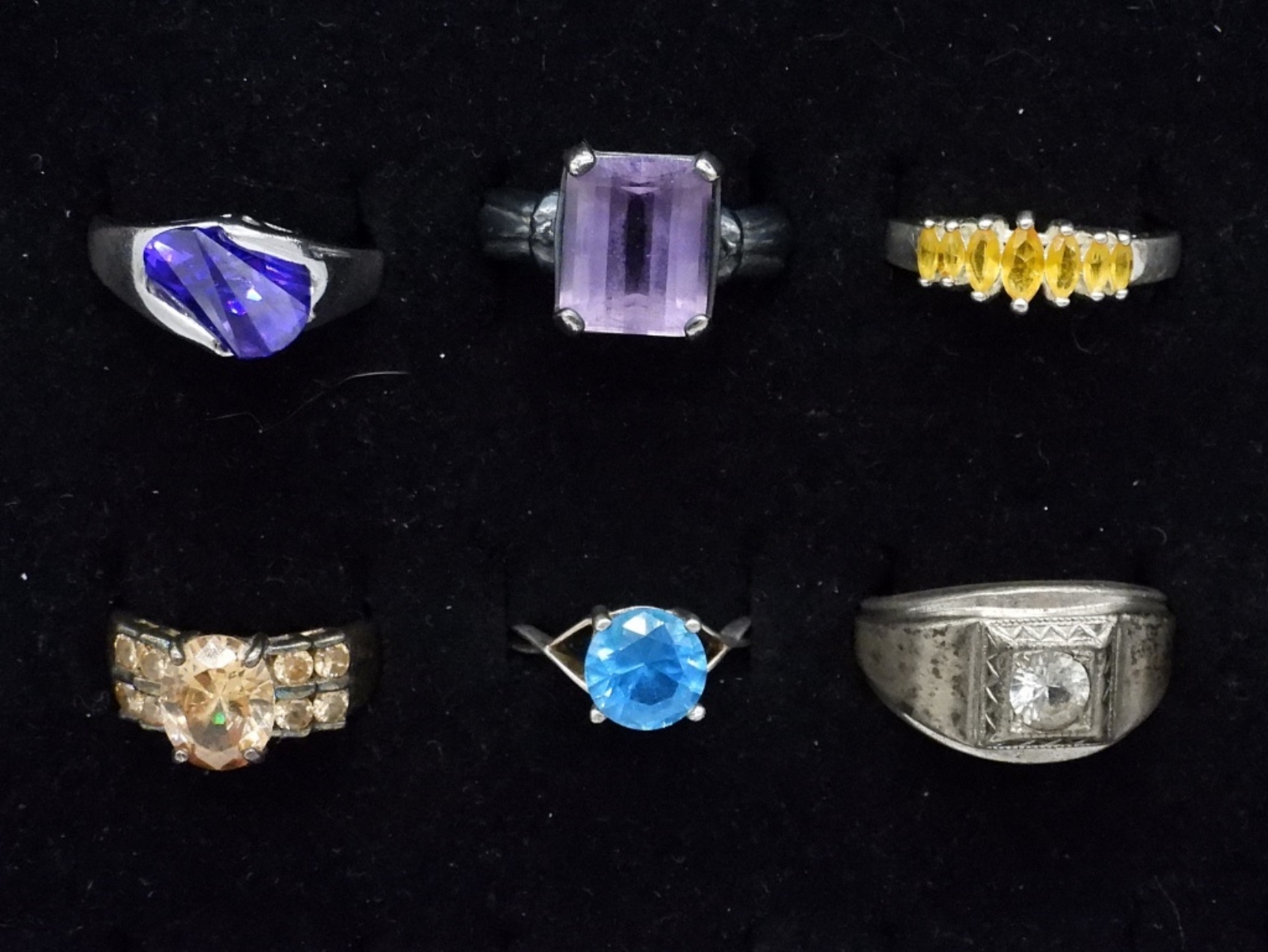 SIX STERLING FASHION RINGS. AMETHYST, BLUE TOPAZ, CITRINE. SIZES 6-10 (22.7 DWT)
