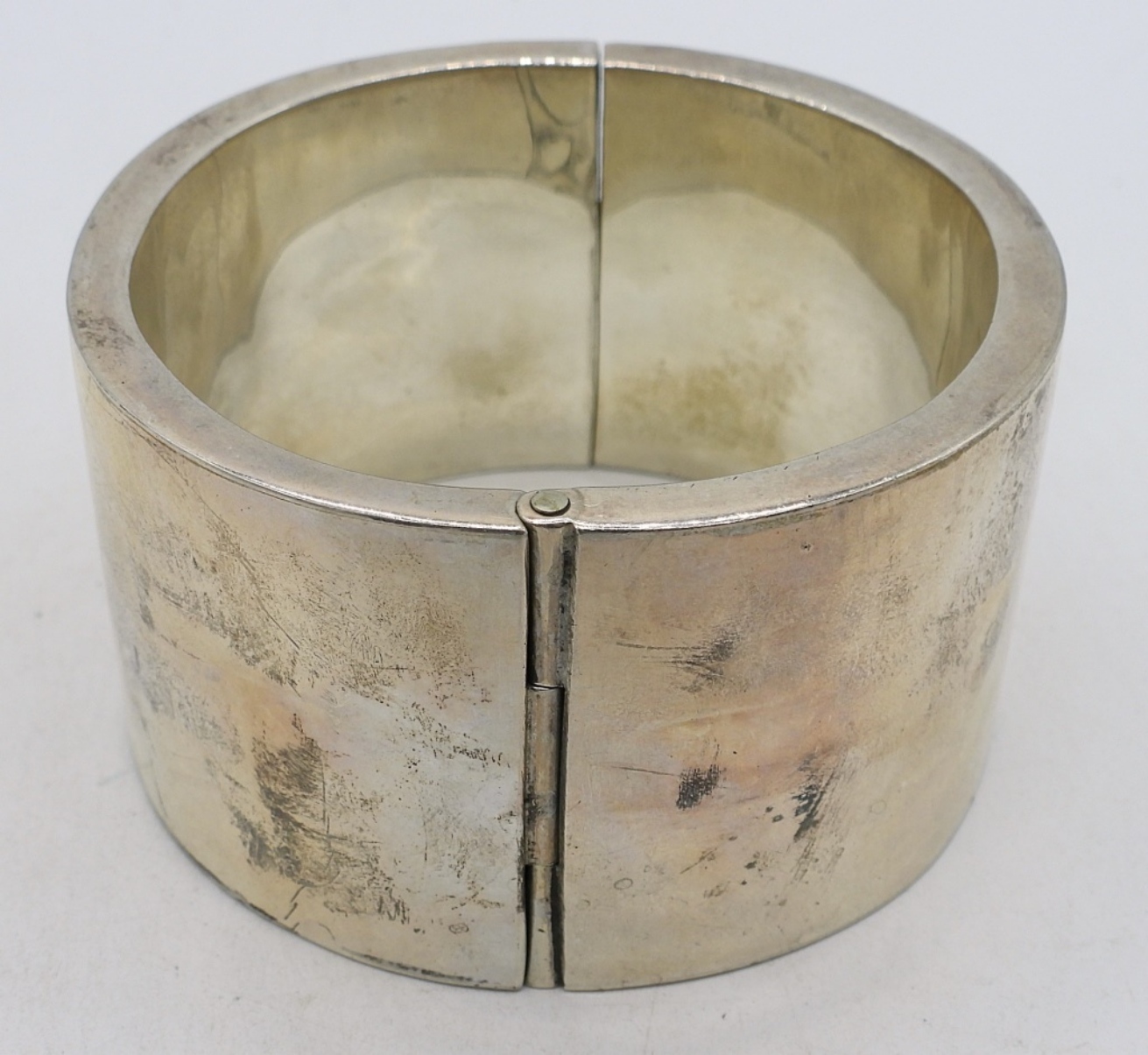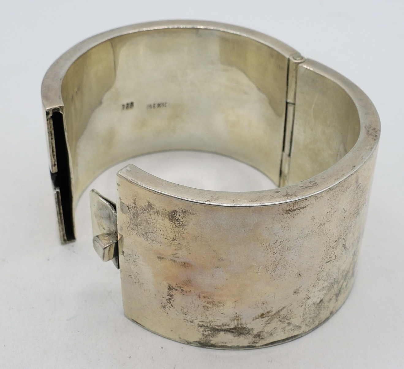 THICK STERLING MEXICO HINGED BRACELET. 8″ AROUND. 1.5″ WIDE. (81.3 DWT)