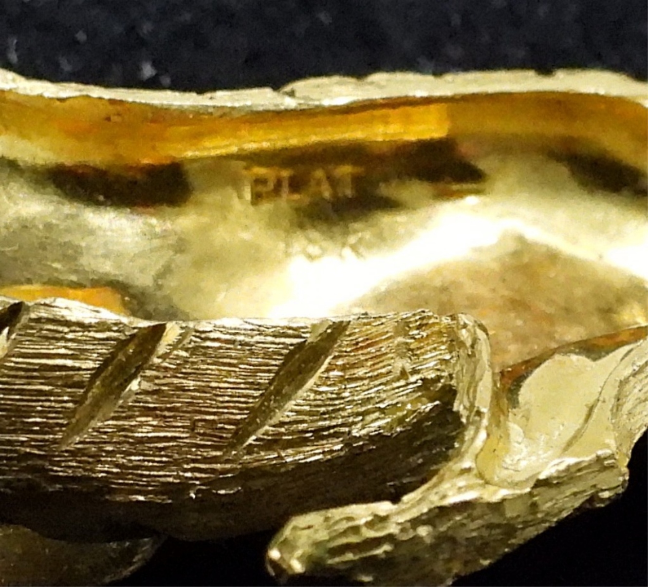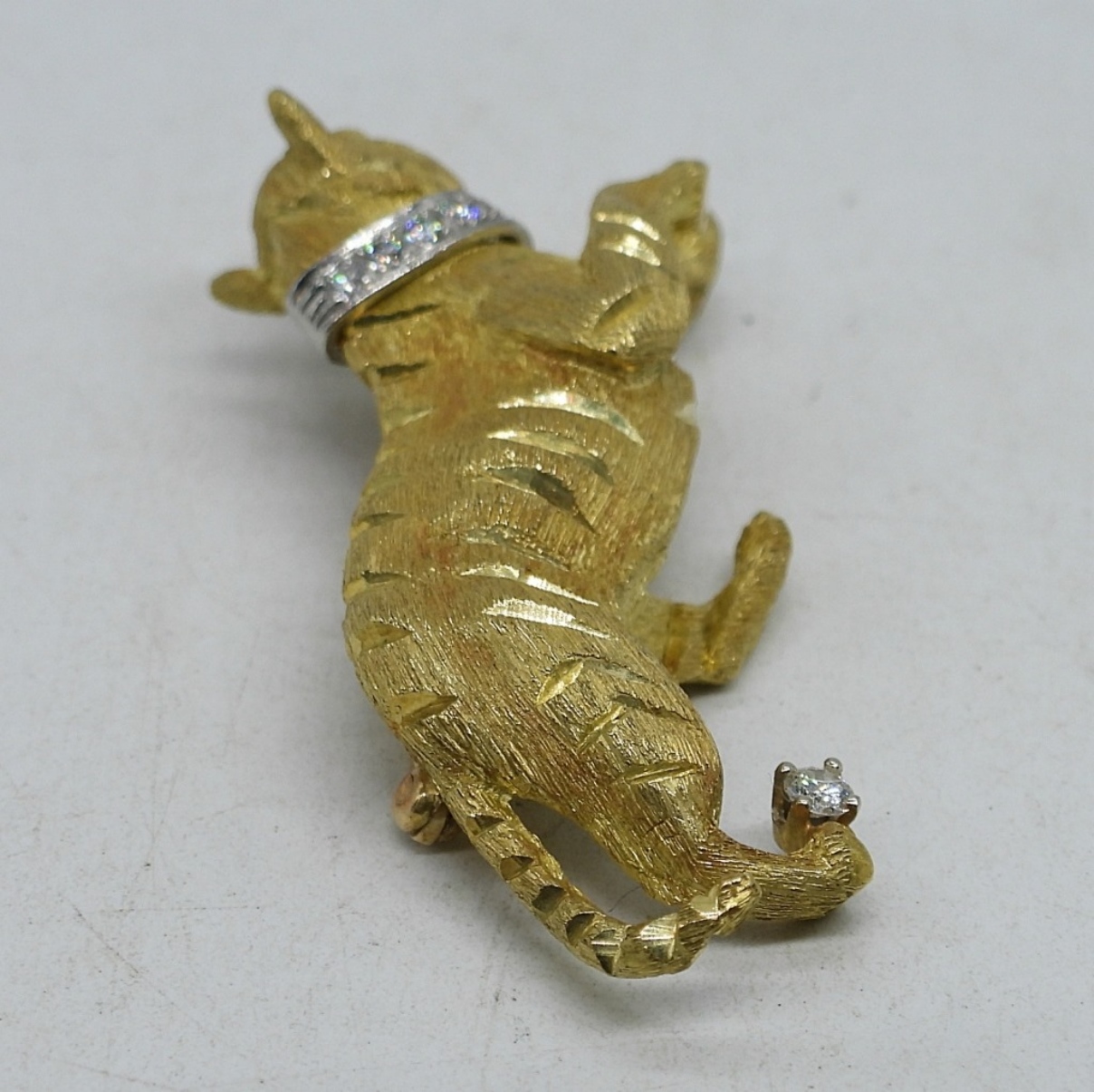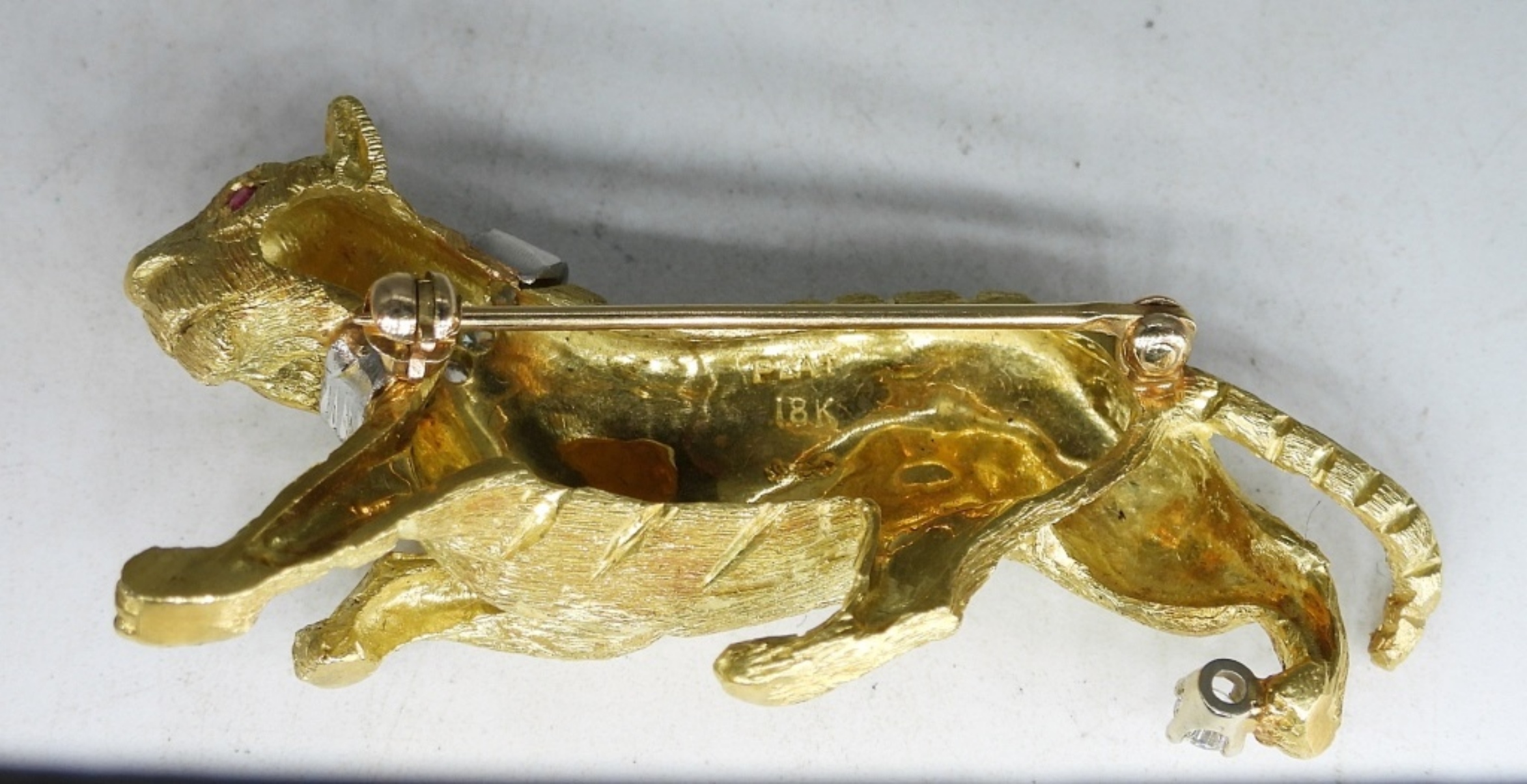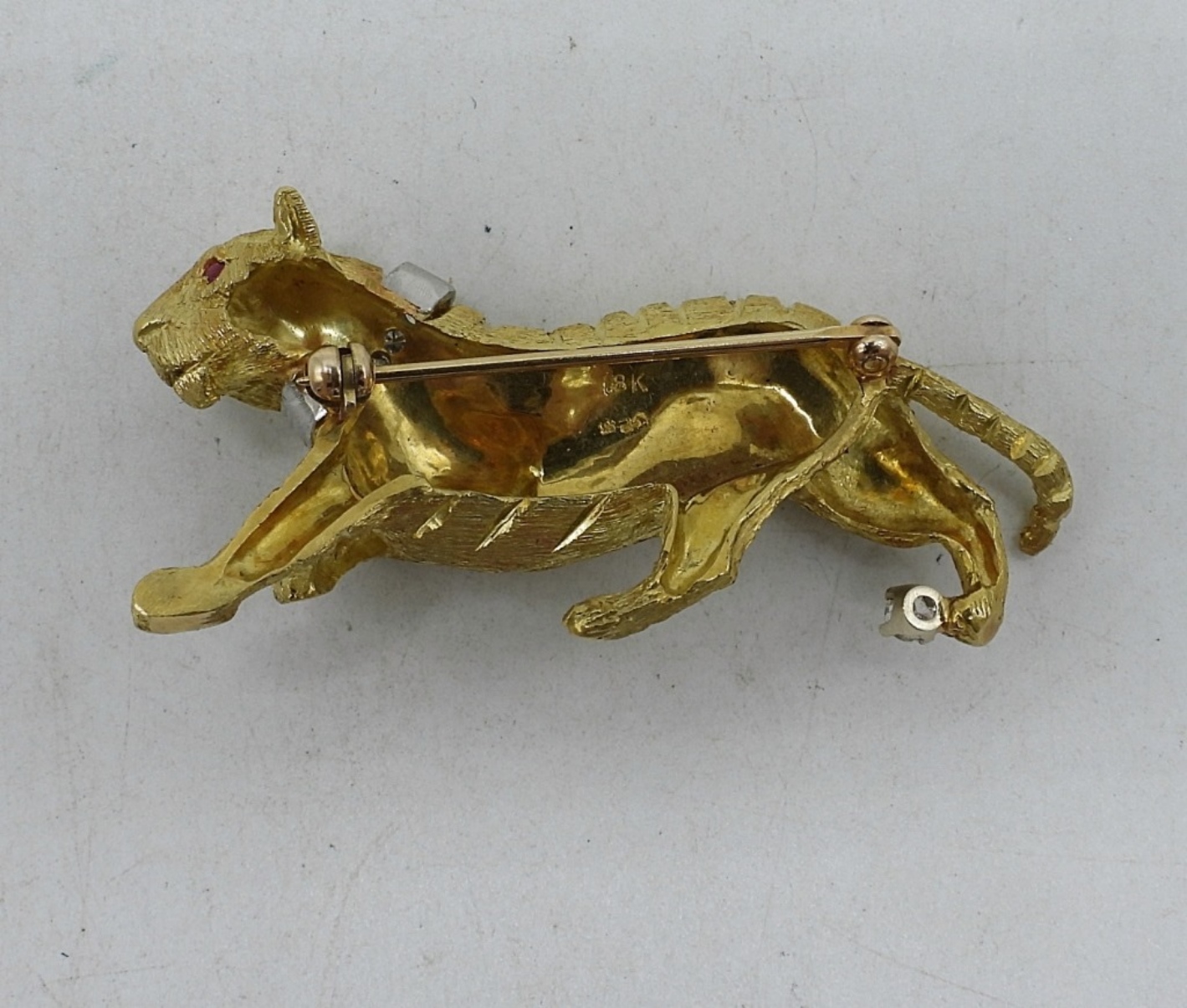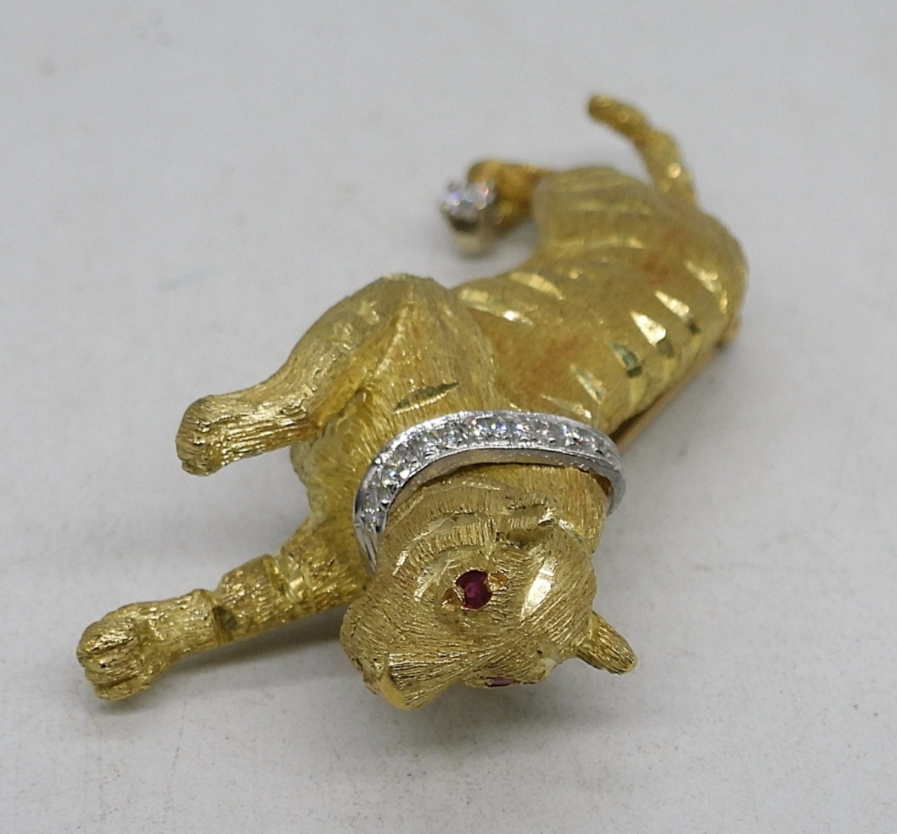 18K YELLOW GOLD & PLATINUM, DIAMOND & RUBY TIGER BROOCH. TIGERS COLLAR IS PLATINUM. 1/4 CARAT DIAMONDS (E/F VVS). TWO SMALL RUBIES FOR EYES. 2″ WIDE, 1″ TALL. (10.2 DWT)