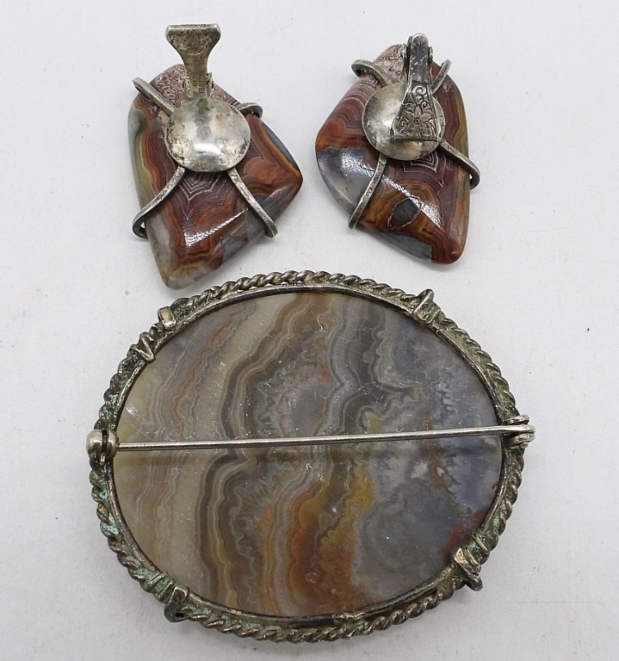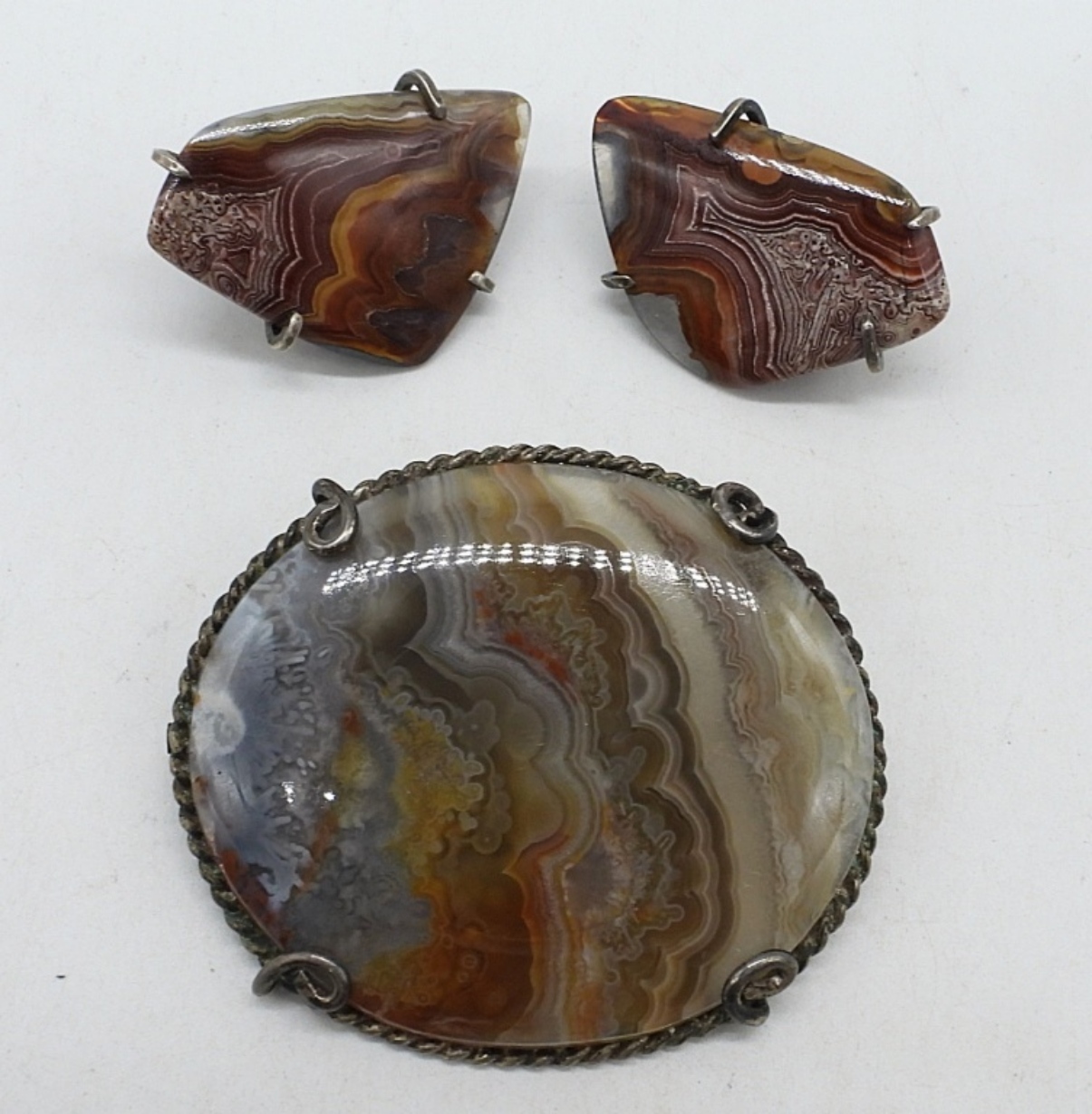AGATE GEMSTONES SET IN STERLING SILVER (MARKED STERLING). PIN IS 2″, CLIP ON EARRINGS ARE 1″. (10 DWT)