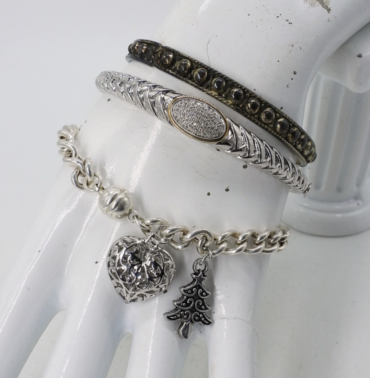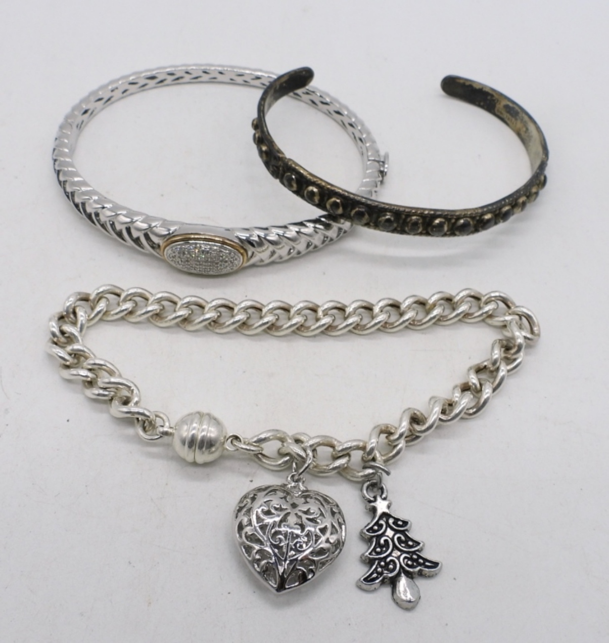 THREE BRACELETS. TWO ARE STERLING 925. CHARM BRACELET IS MARKED ITALY MILOR 950. 7-8″. (33.7 DWT)