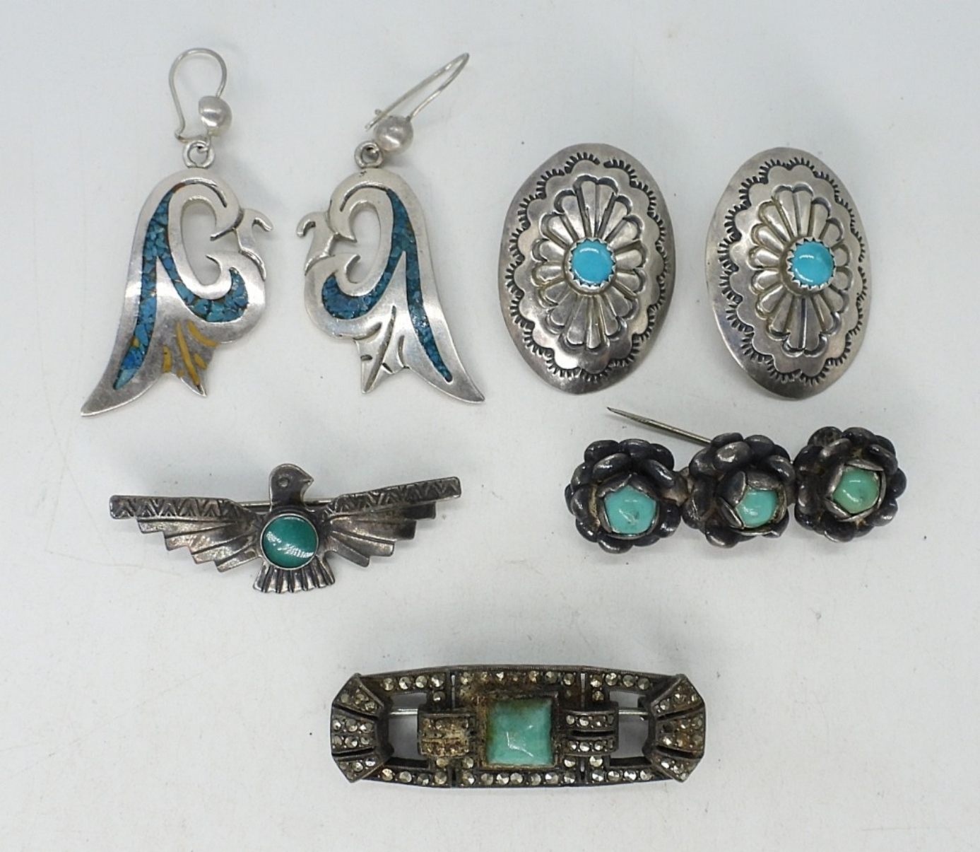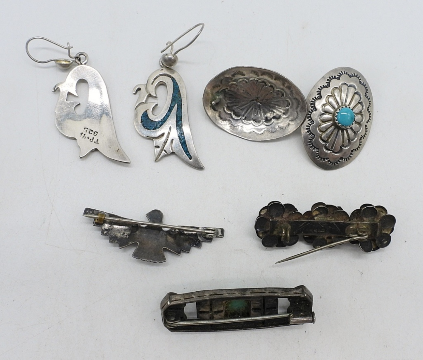 ONE PAIR OF TAXCO INLAID TURQUOISE PIERCED EARRINGS, TP-41. PIERCED TURQUOISE OVAL EARRINGS. THREE SMALL STERLING TURQUOISE BROOCHES. FLORAL BROOCHES CLASP IS BROKEN. 1.5-2″. (23.4 DWT)