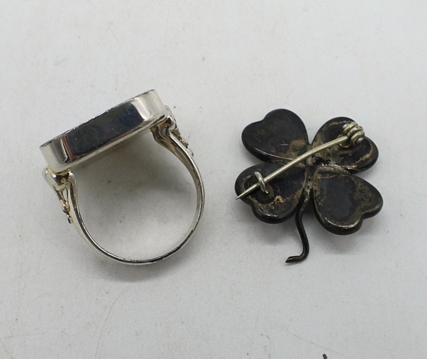 VINTAGE STERLING ABALONE BRACELET, 7″. ABALONE FOUR LEAF CLOVER PIN, 1″. ABALONE RING SIZE 7.5 & CUFF BRACELET WITH MOTHER OF PEARL AND TURQUOISE GEMSTONES. (28.3 DWT)