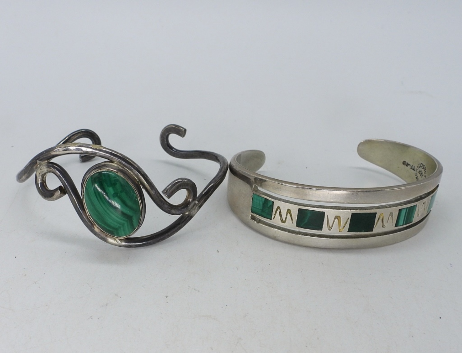 TWO STERLING MALACHITE BRACELETS. ONE IS TAXCO “TF-49″. 7”. (30.8 DWT)