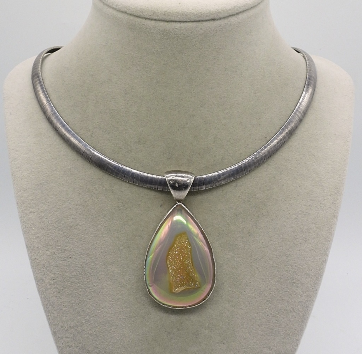 18″ STERLING CHAIN, WITH LARGE STERLING PENDANT. WHITE DRUZY AGATE GEMSTONE. PENDANT IS 2.5″ LONG. (30.8 DWT)