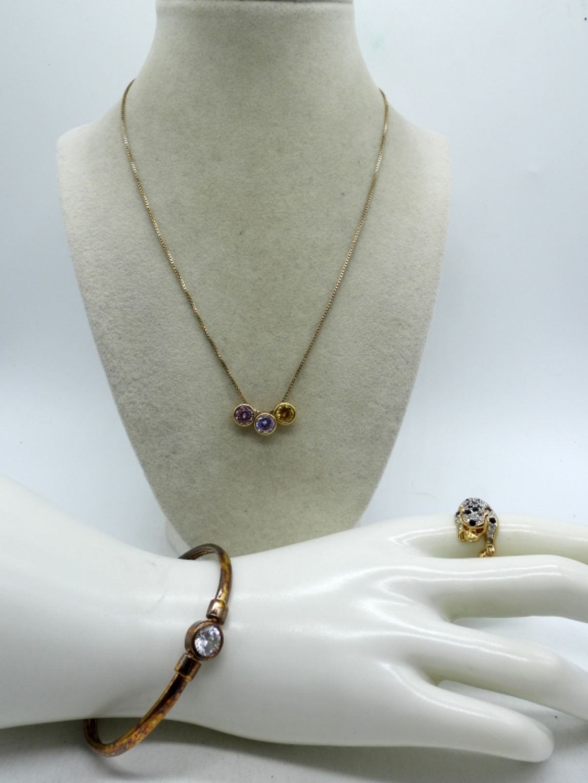 GOLD TONE STERLING. BANGLE BRACELET – HIDDEN CLASP. RING SIZE 9. NECKLACE, 18″. (13 DWT)