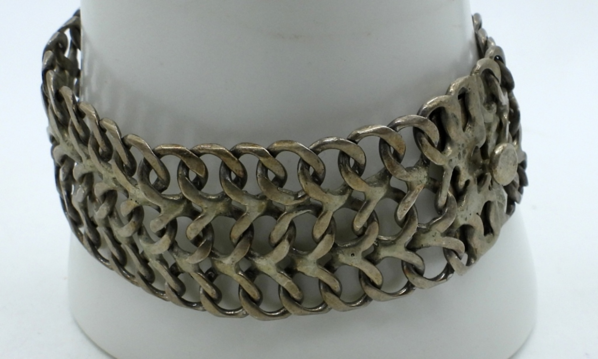 VINTAGE STERLING BRACELET, 7″ LONG, 1″ WIDE. AZTEK CALENDAR CHARM. (23.6 DWT)