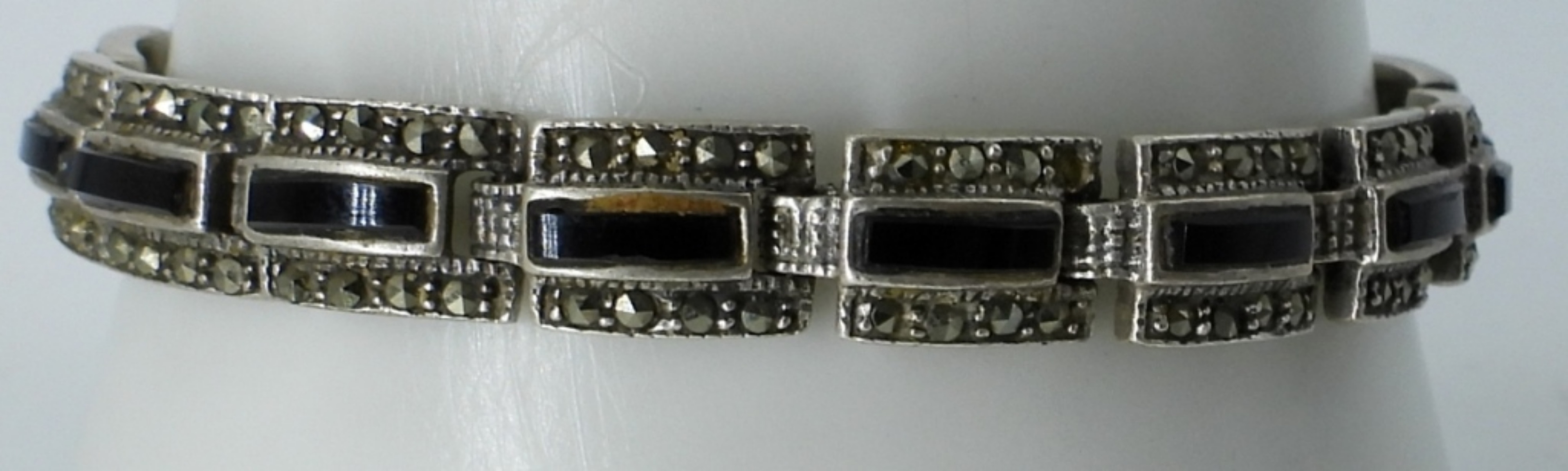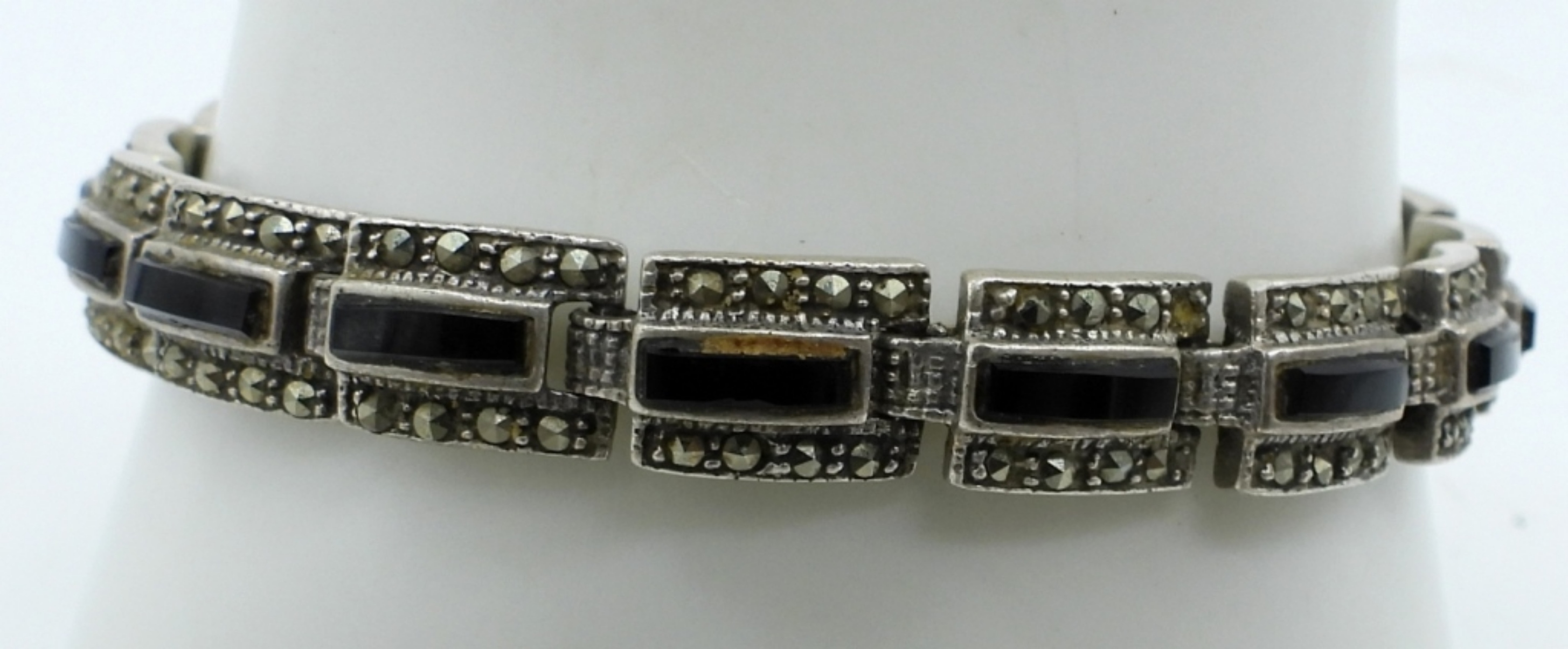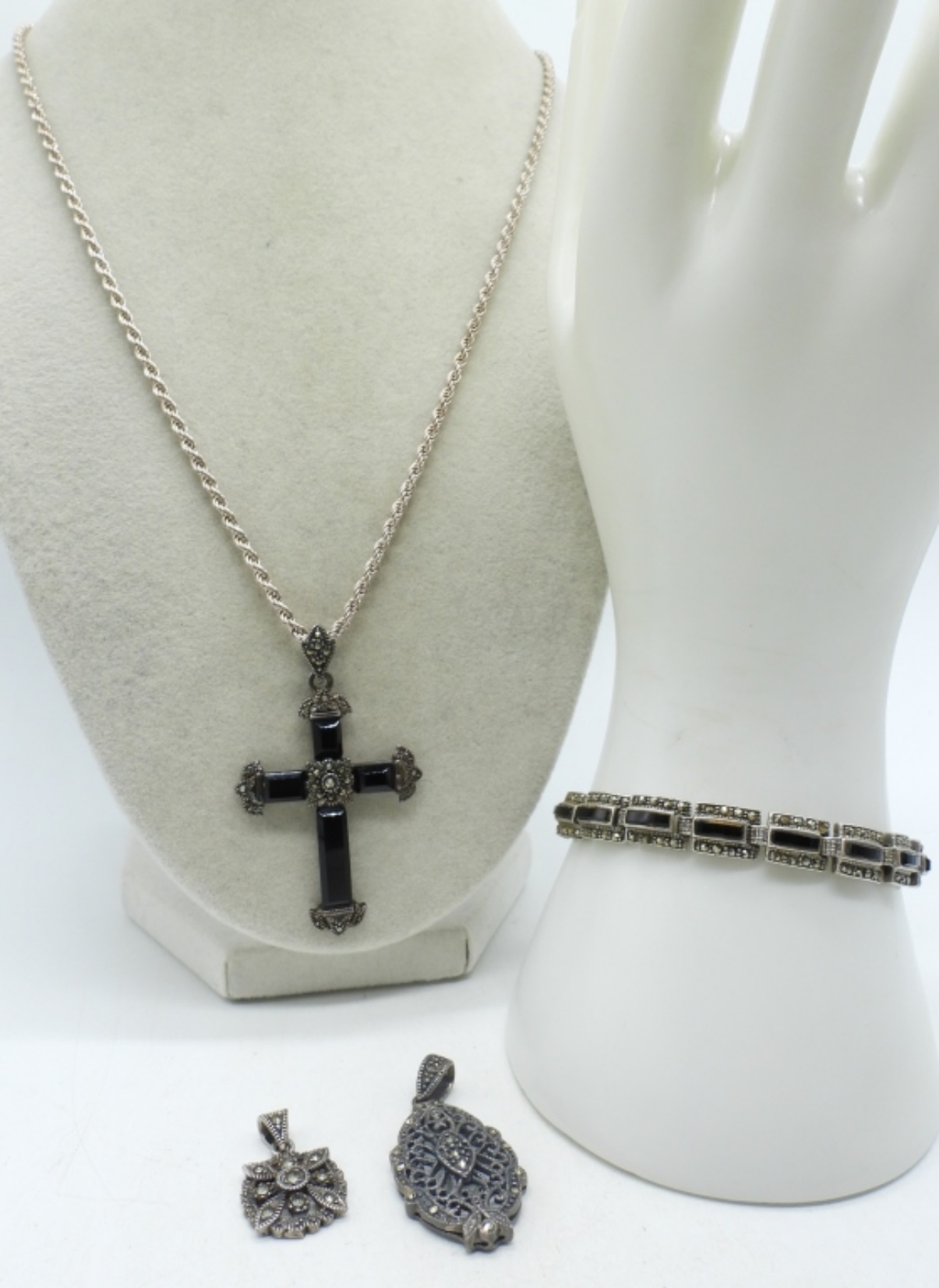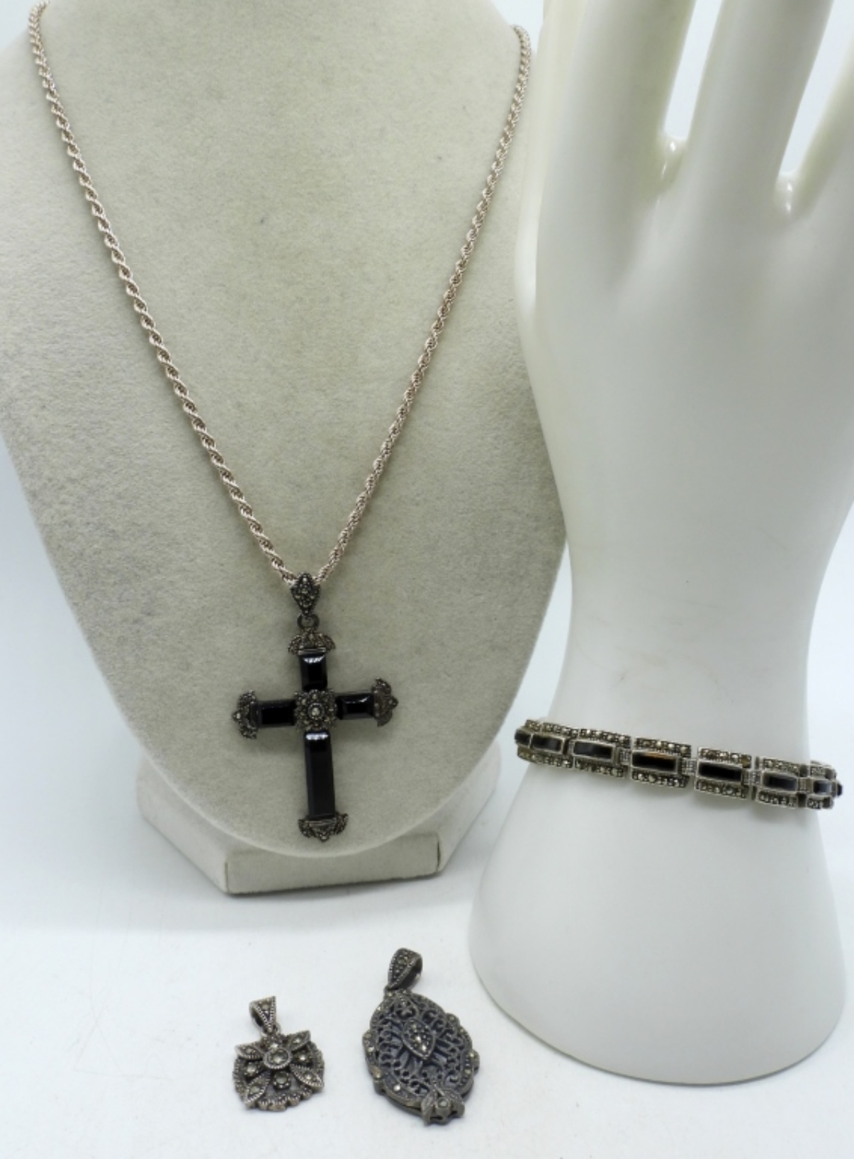 VINTAGE STERLING. TWO MARCASITE PENDANTS. CROSS PENDANT, BLACK ONYX & MARCASITE ON A 20″ CHAIN. 7″ STERLING BLACK ONYX MARCASITE BRACELET. (28 DWT)