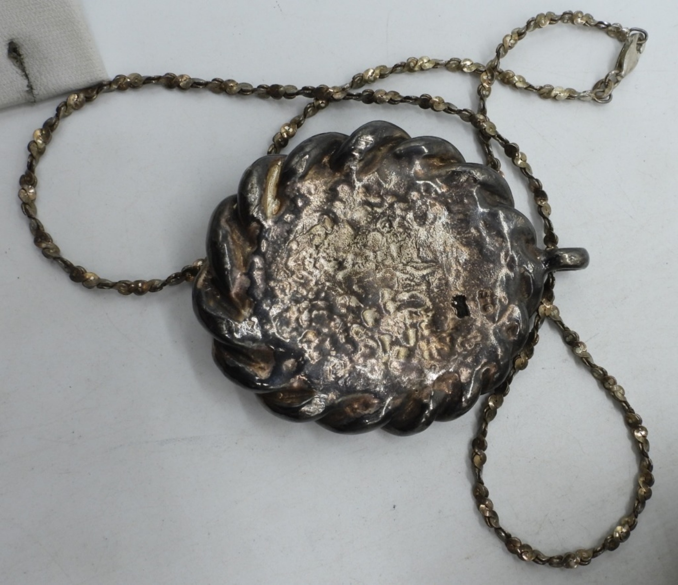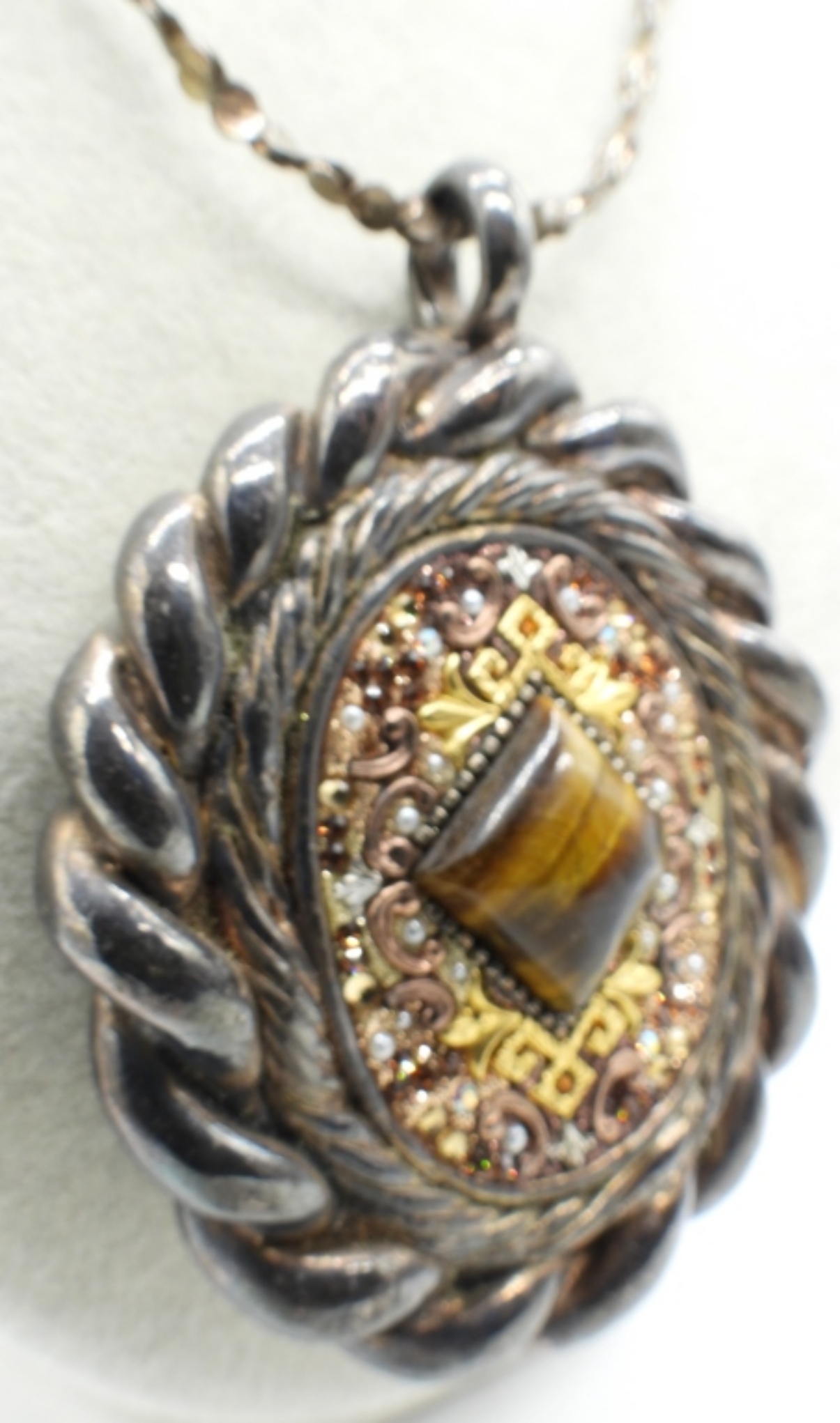 HUGE STERLING (MARKED 925 SO) PENDANT WITH TIGERS EYE. CHAIN IS 20″. (28.2 DWT)