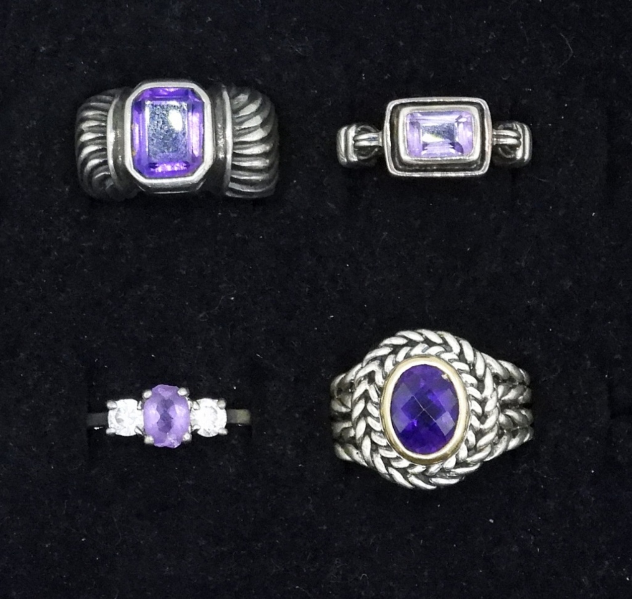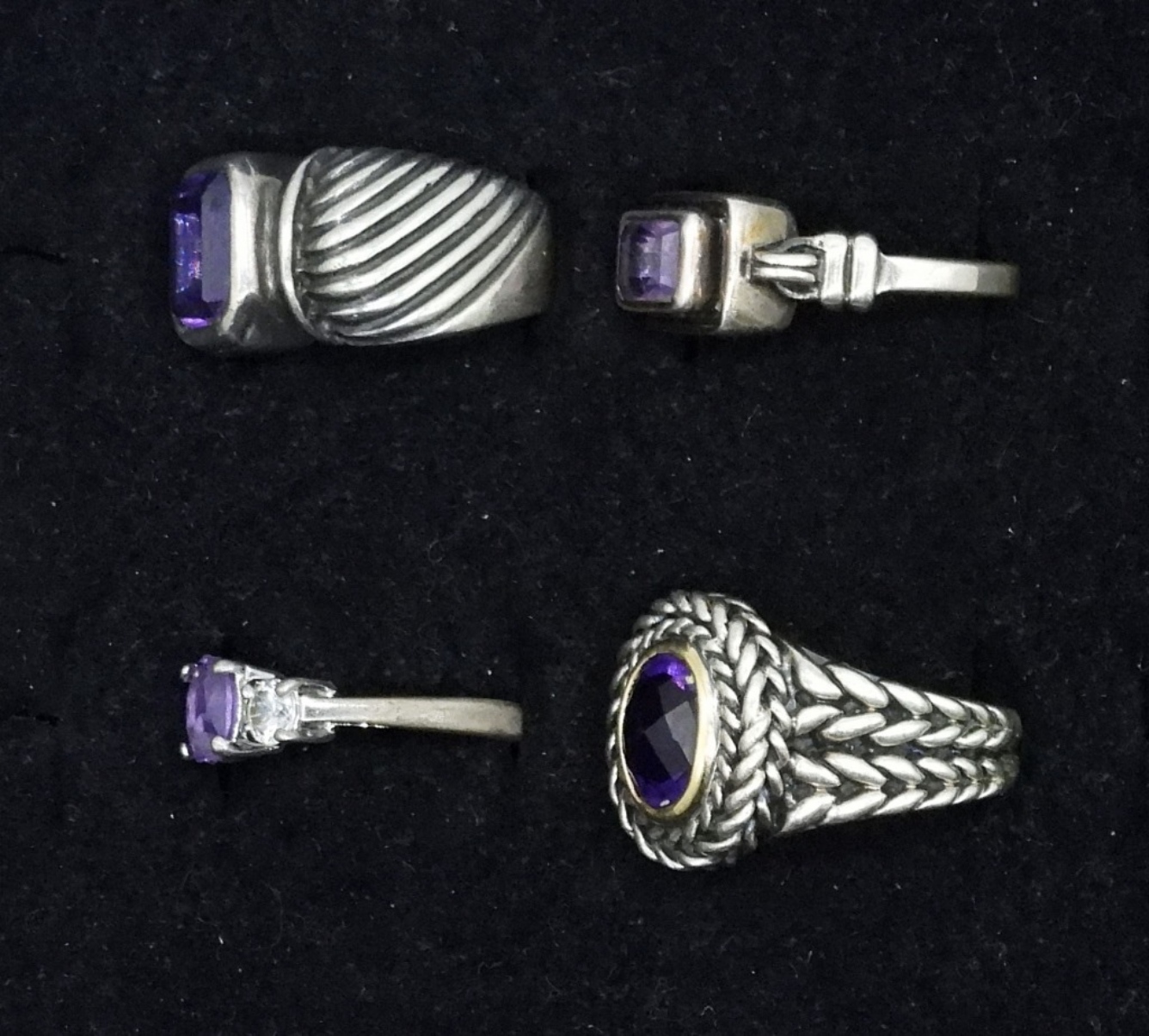 FOUR STERLING AMETHYST GEMSTONE FASHION RINGS. SIZES 6 & 7. (22 DWT)