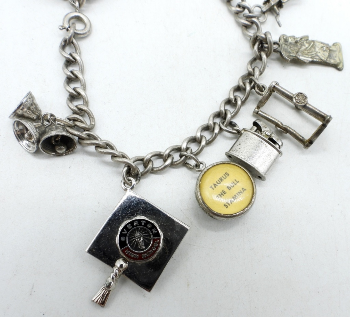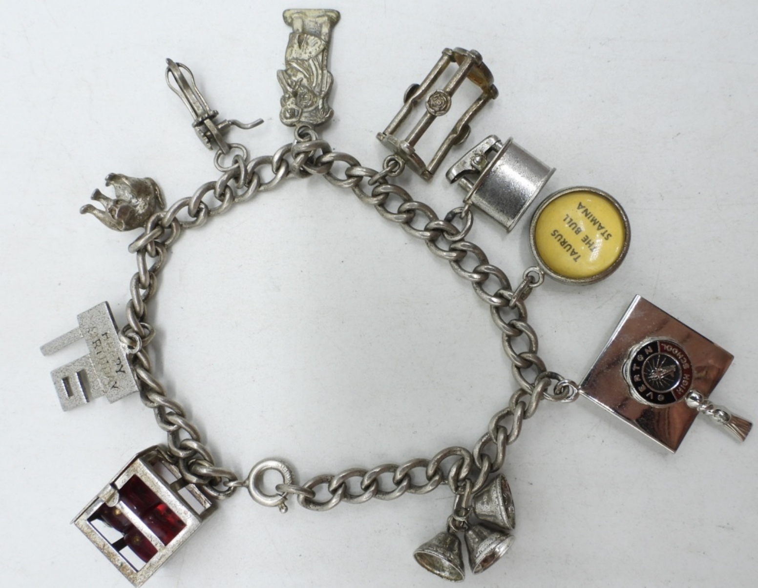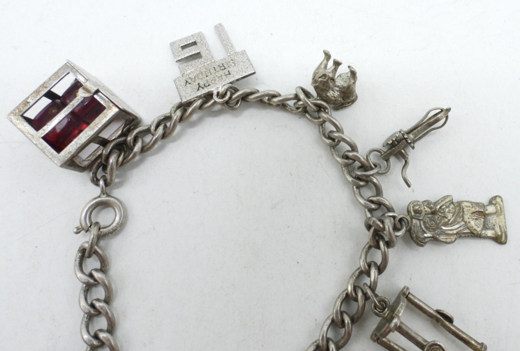 7″ STERLING VINTAGE CHARM BRACELET, 7″ WITH TEN CHARMS. (17.1 DWT)