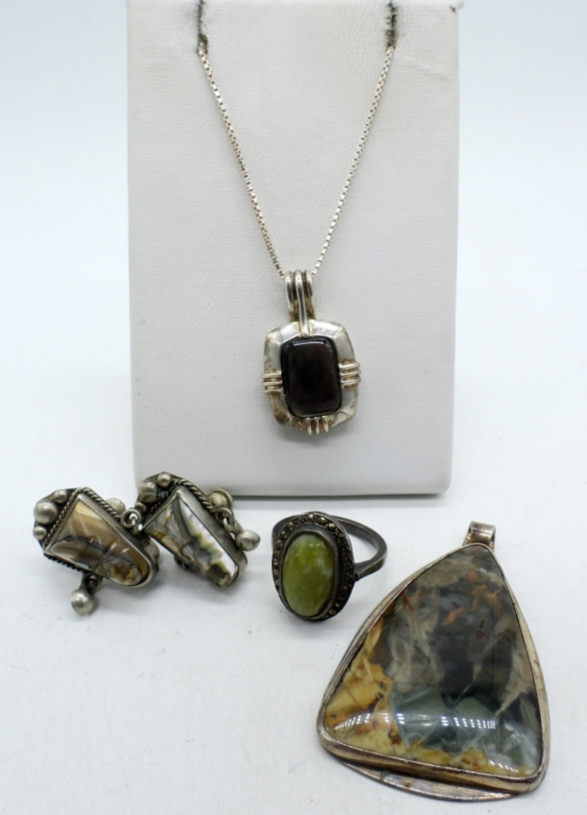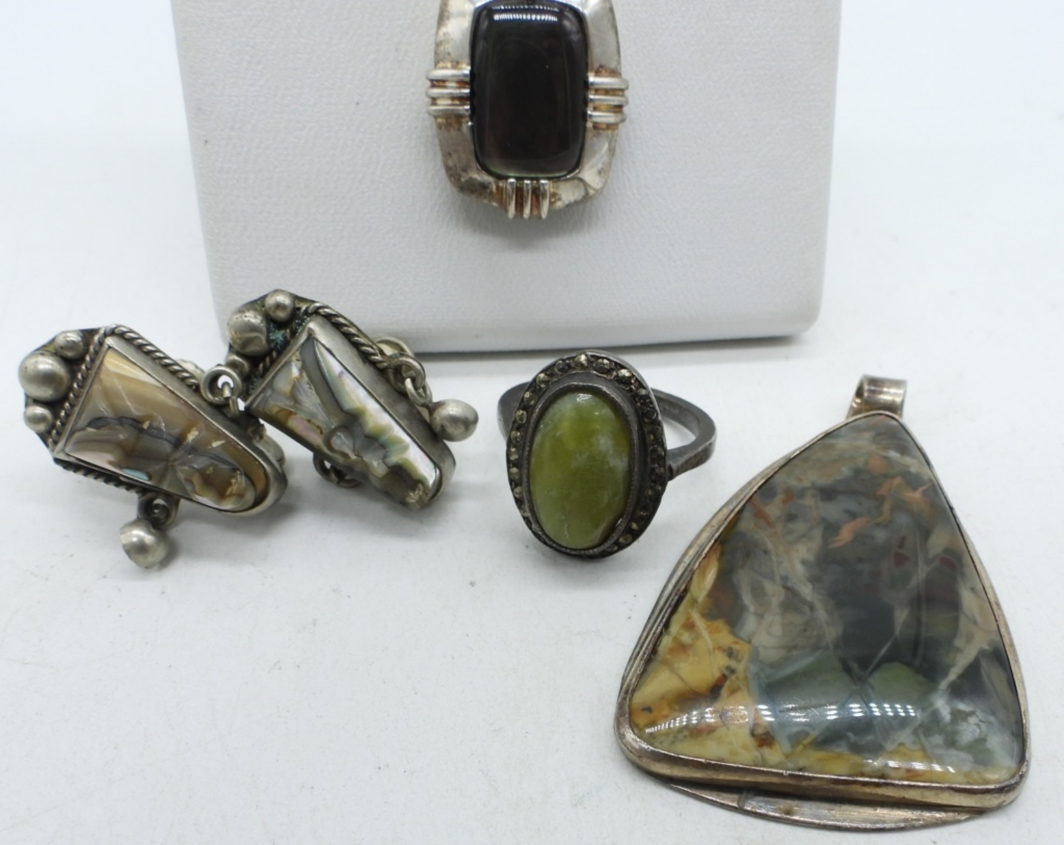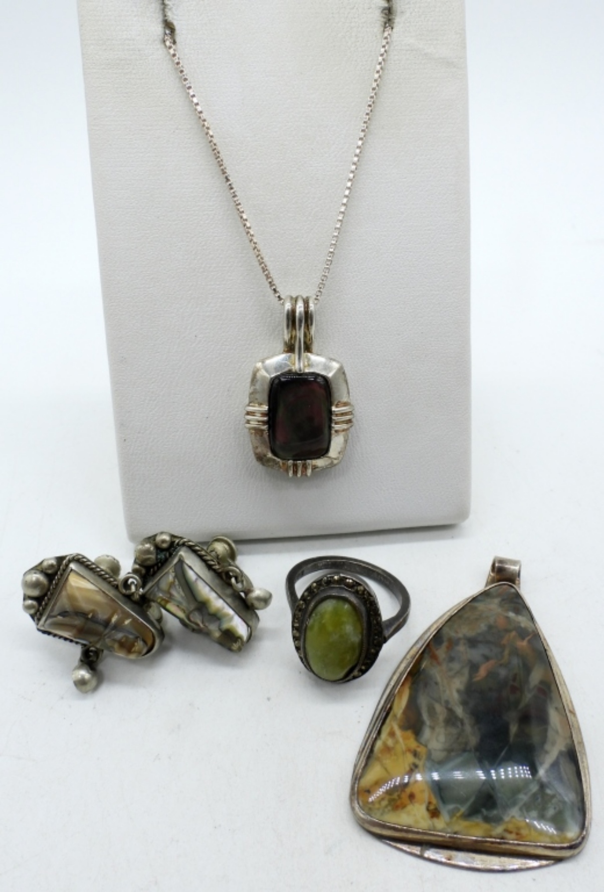 VINTAGE STERLING. ABALONE SCREW BACK EARRINGS. GREEN TURQUOISE RING, SIZE 6. TWO STERLING PENDANTS, 1-2″ LONG. 18″ CHAIN. (19.2 DWT)