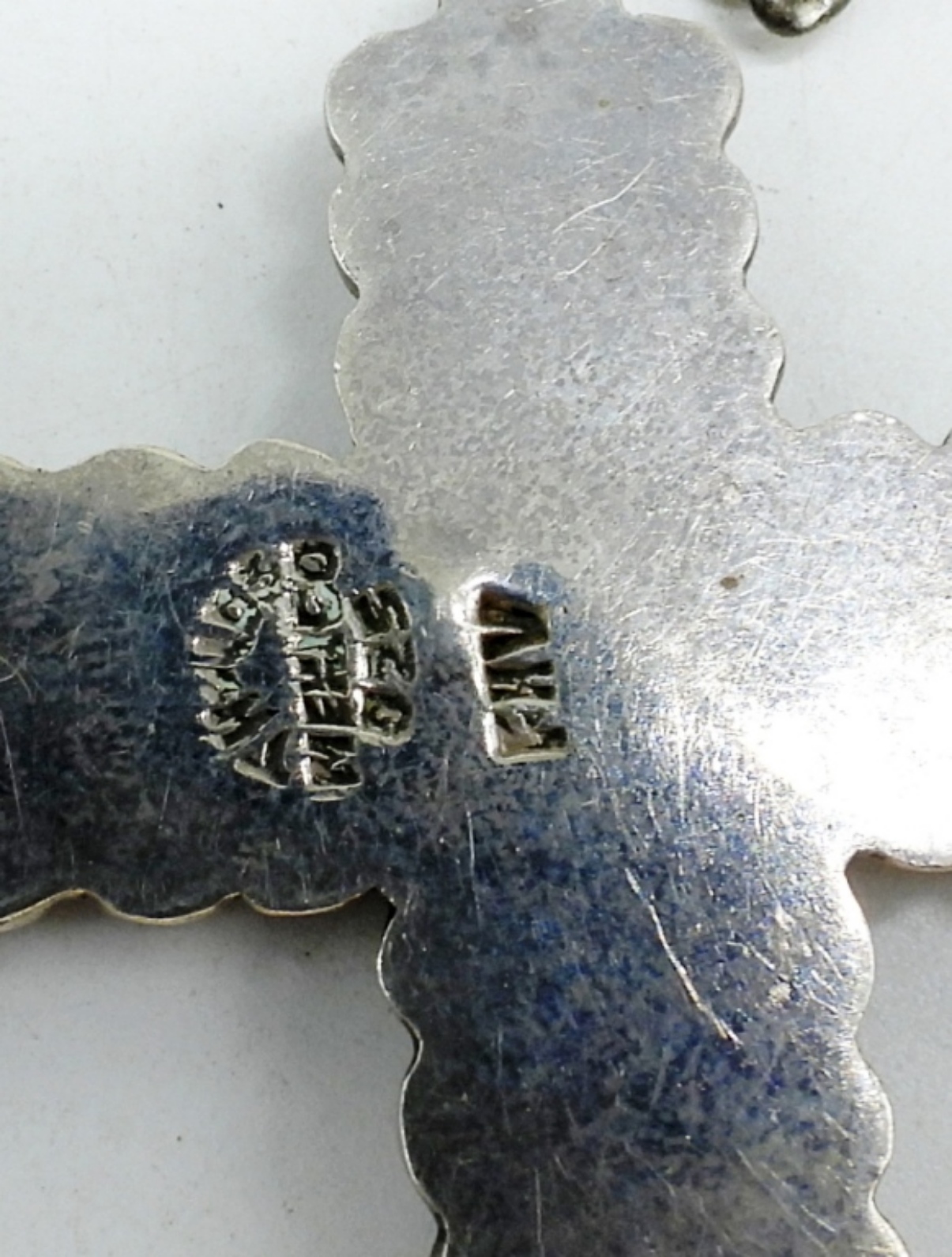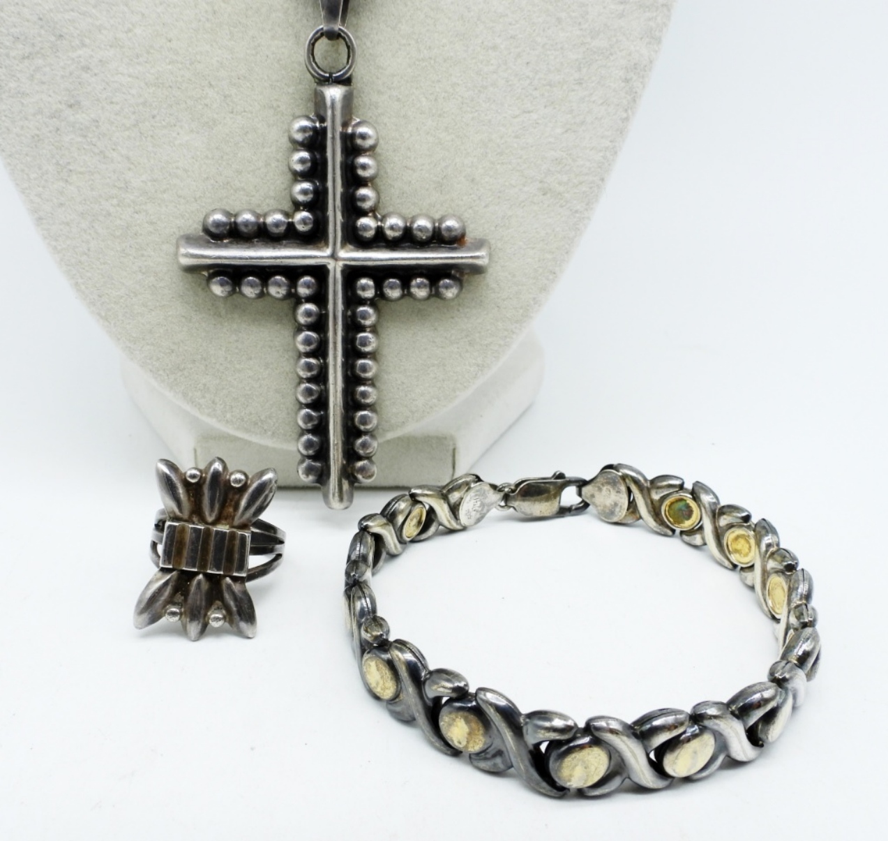 VINTAGE STERLING LARGE CROSS PENDANT 3″. STERLING CHAIN 29″. BRACELET, 7.5″. RING SIZE 6 (36.6 DWT)