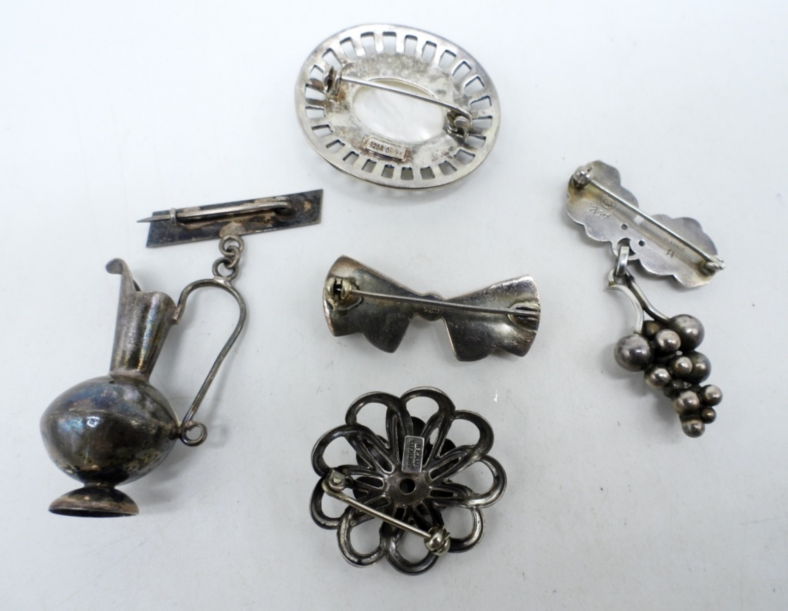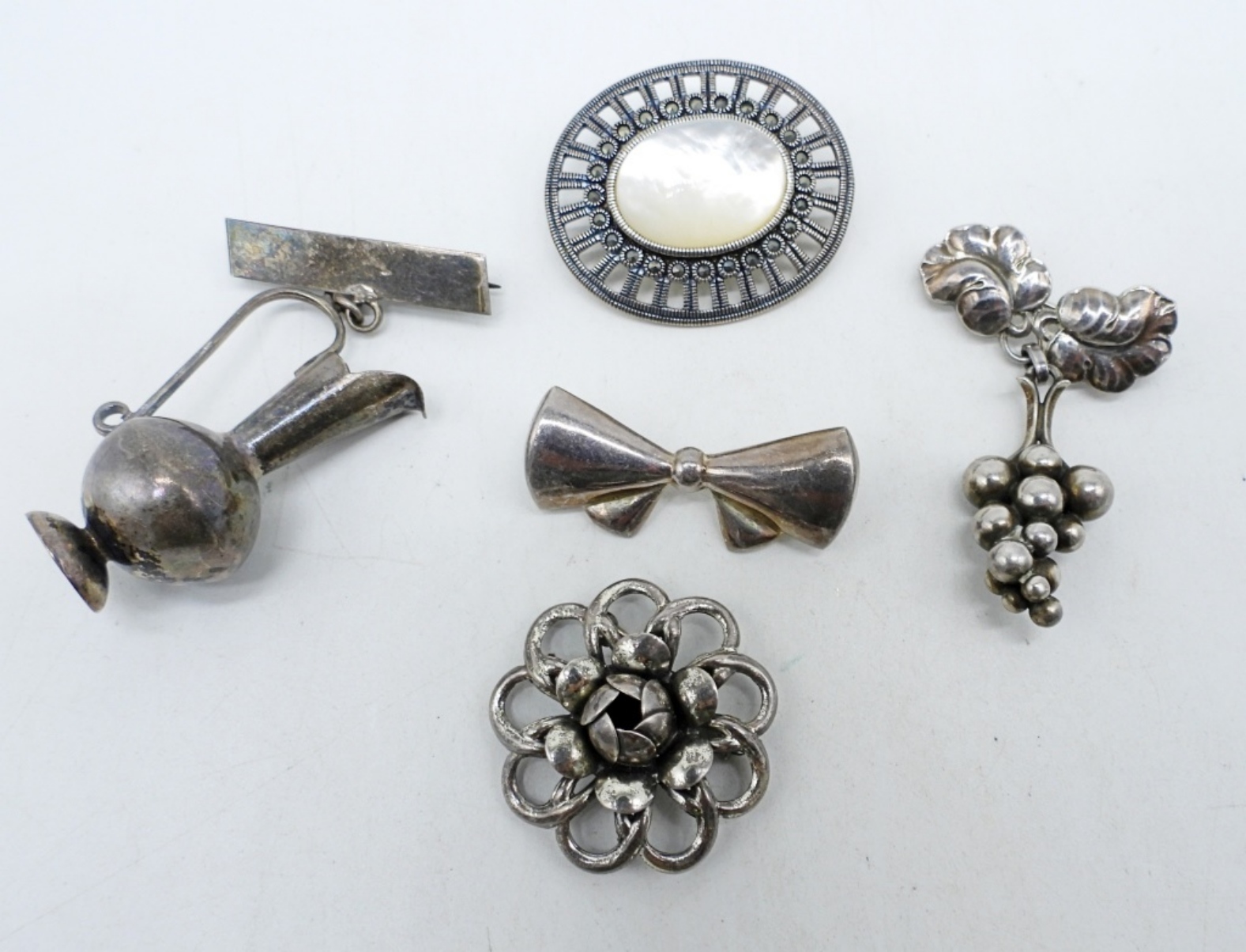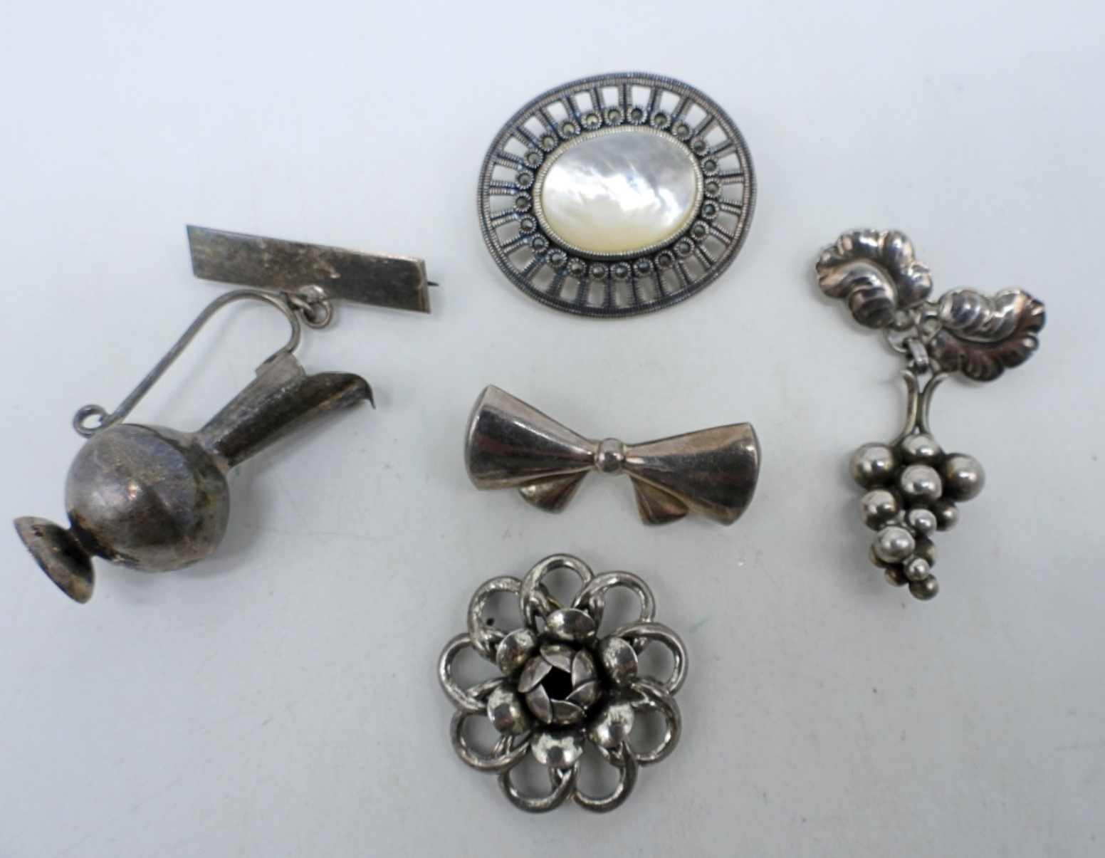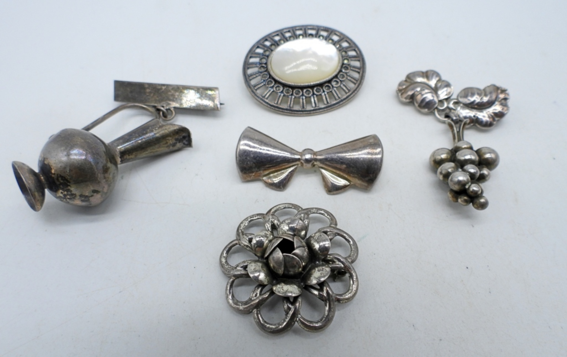 BEAU STERLING FLOWER BROOCH. DENMARK GEORG JENSEN 925 GRAPE BROOCH. THREE OTHER STERLING BROOCHES, MOTHER OF PEARL BROOCH HAS BROKEN CLASP. (22 DWT)