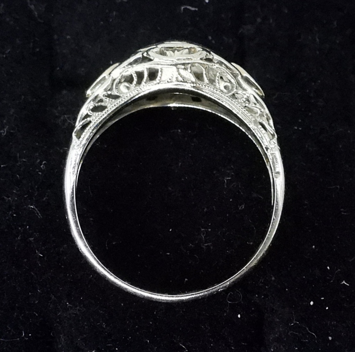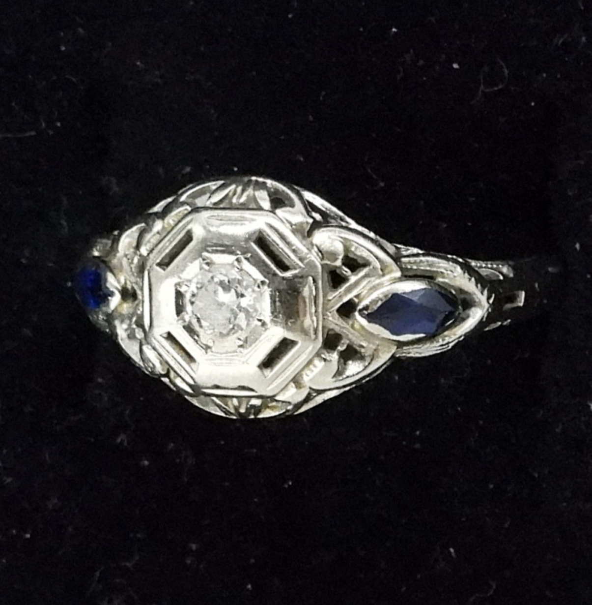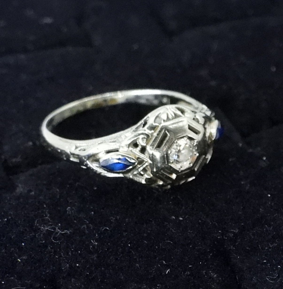 VINTAGE 18K WHITE GOLD RING WITH SMALL CENTER DIAMOND AND TWO SMALL SIDE SAPPHIRES. SIZE 6 1/4. (1.4 DWT)