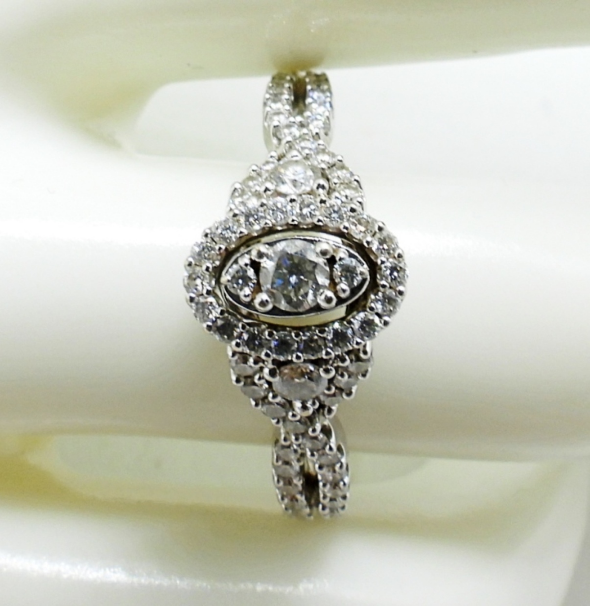 10K WHITE GOLD DIAMOND HALO ENGAGEMENT RING, SIZE 8.5 ENGRAVED “I CHOOSE US”. STAMPED: 10K ZEI. (2 DWT)