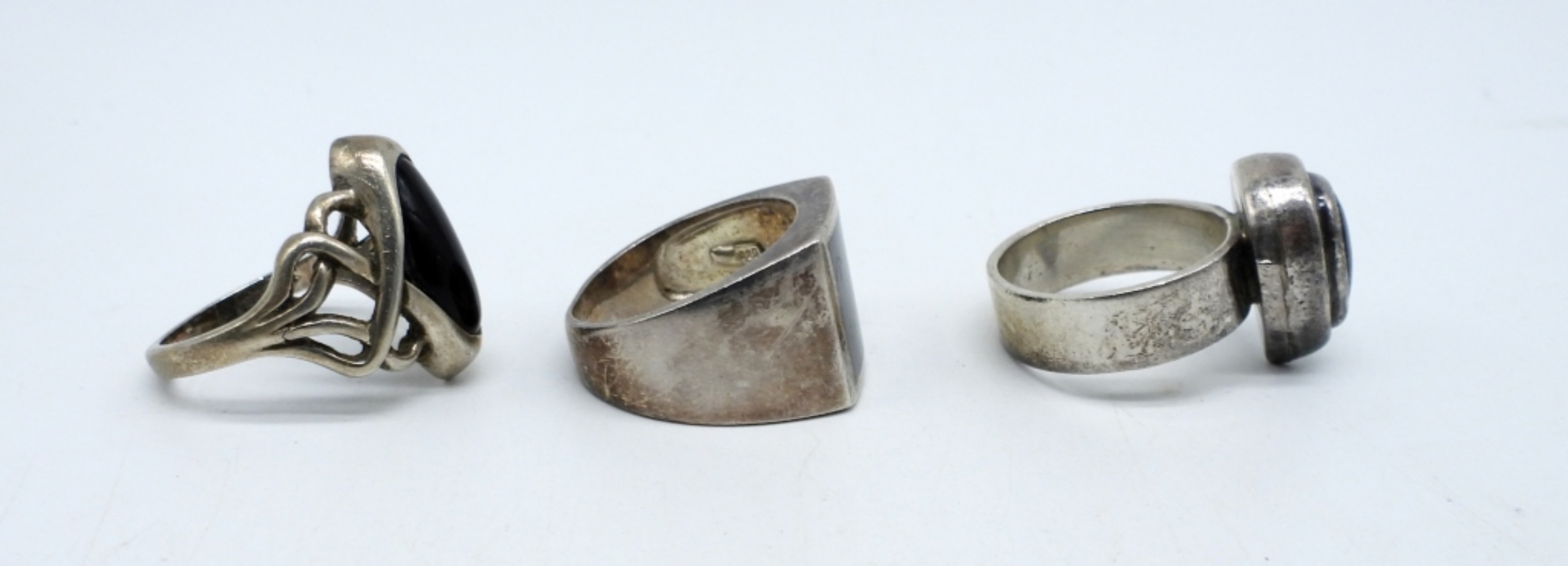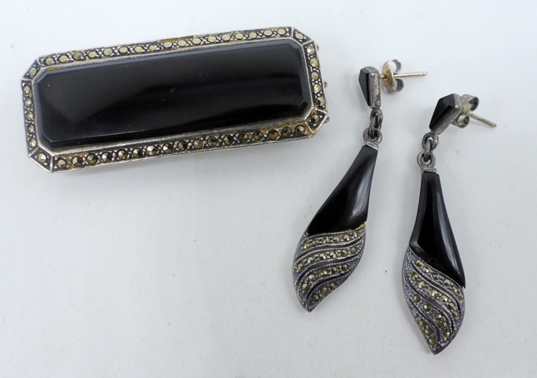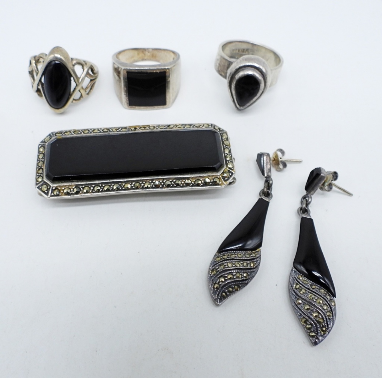 VINTAGE STERLING JEWELRY. MEXICO 925 BLACK ONYX TEARDROP RING, SIZE 8. TWO OTHER STERLING ONYX RINGS, SIZE 9. BLACK ONYX/MARCASITE PIERCED EARRINGS & BROOCH. (29.4 DWT)
