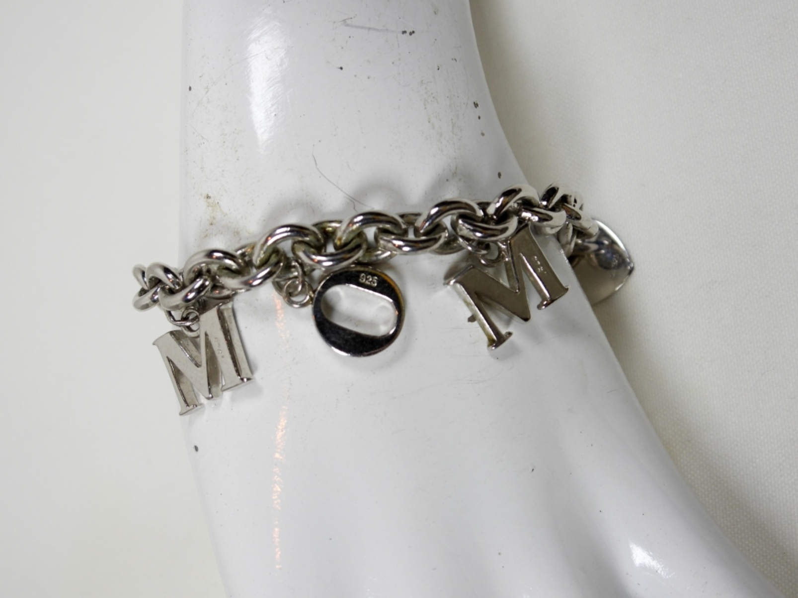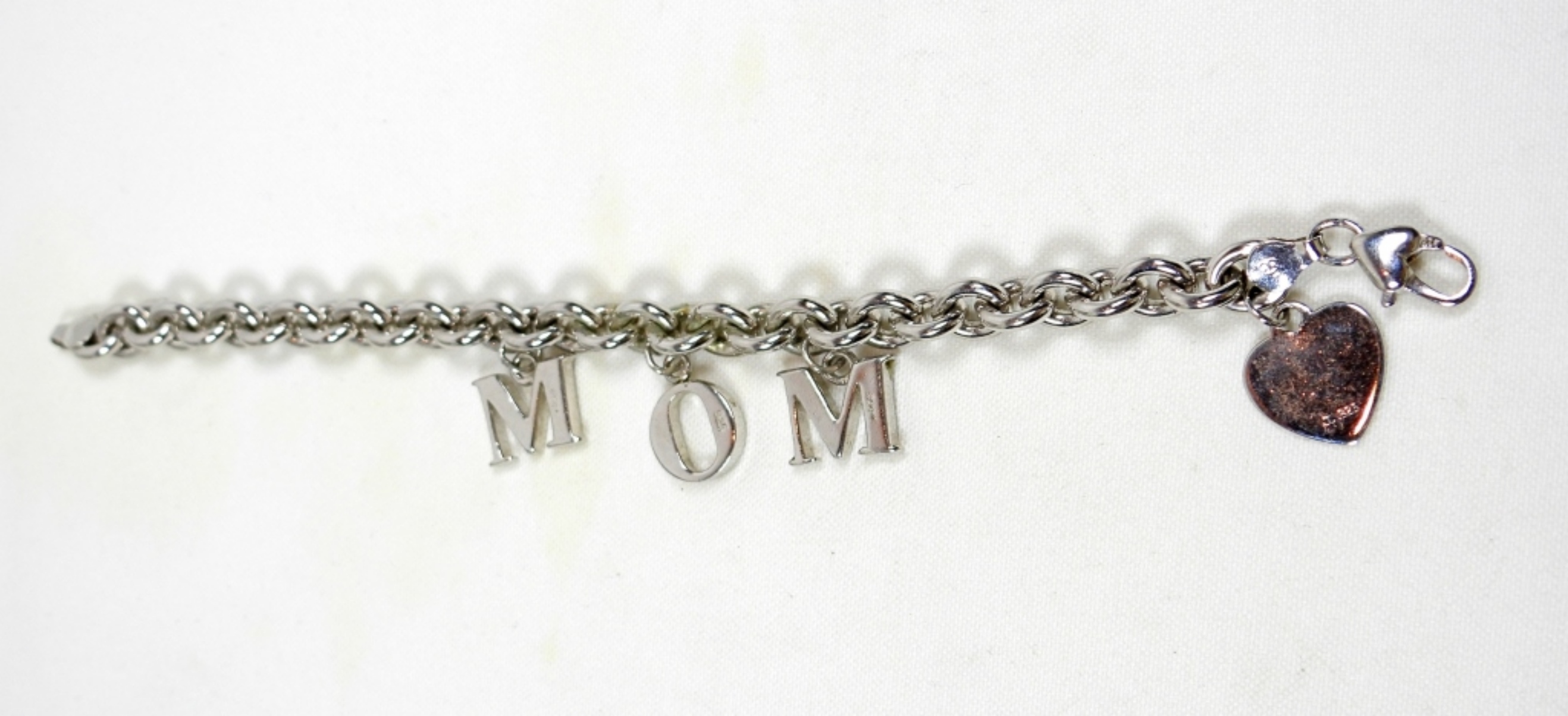 7” STERLING BRACELET. FOUR CHARMS, M O M & HEART (20.9 DWT)